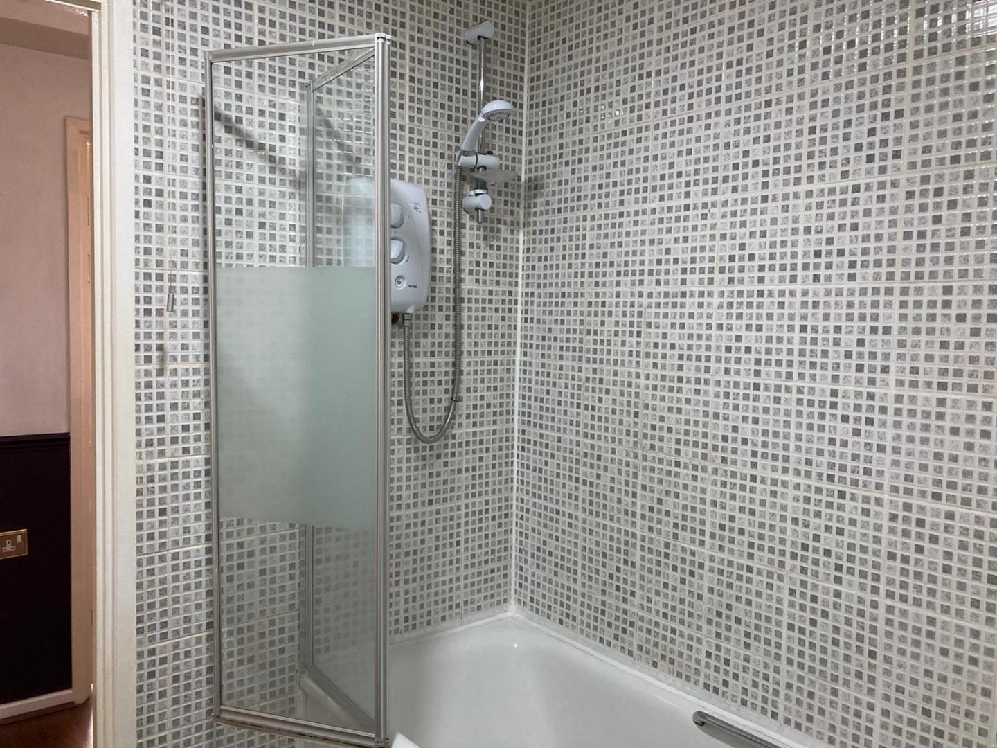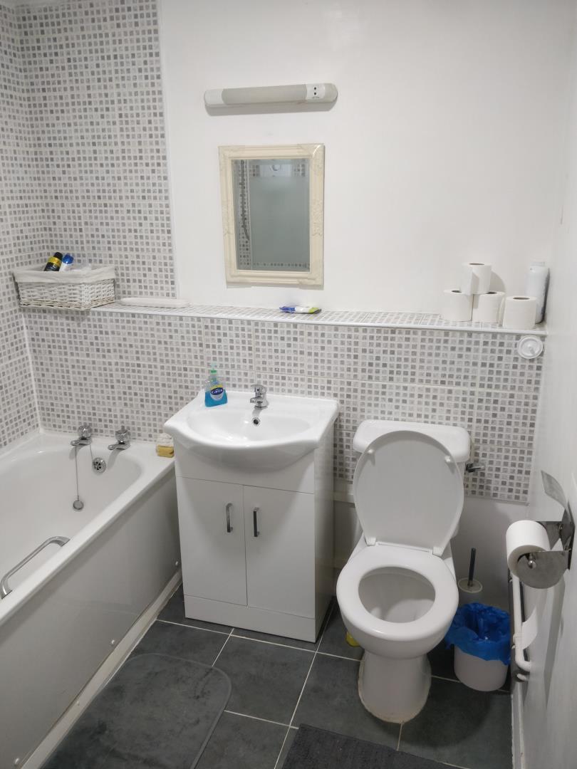 Bathtub. Extractor fan. Shower over the bath. Washbasin with mixer tap. Toilet. Spacious. Shelving. Ceramic floor tiles. Spot lights. Low voltage lighting. Fitted with a three piece suite. Cupboard. Storage. Recently Modernised.