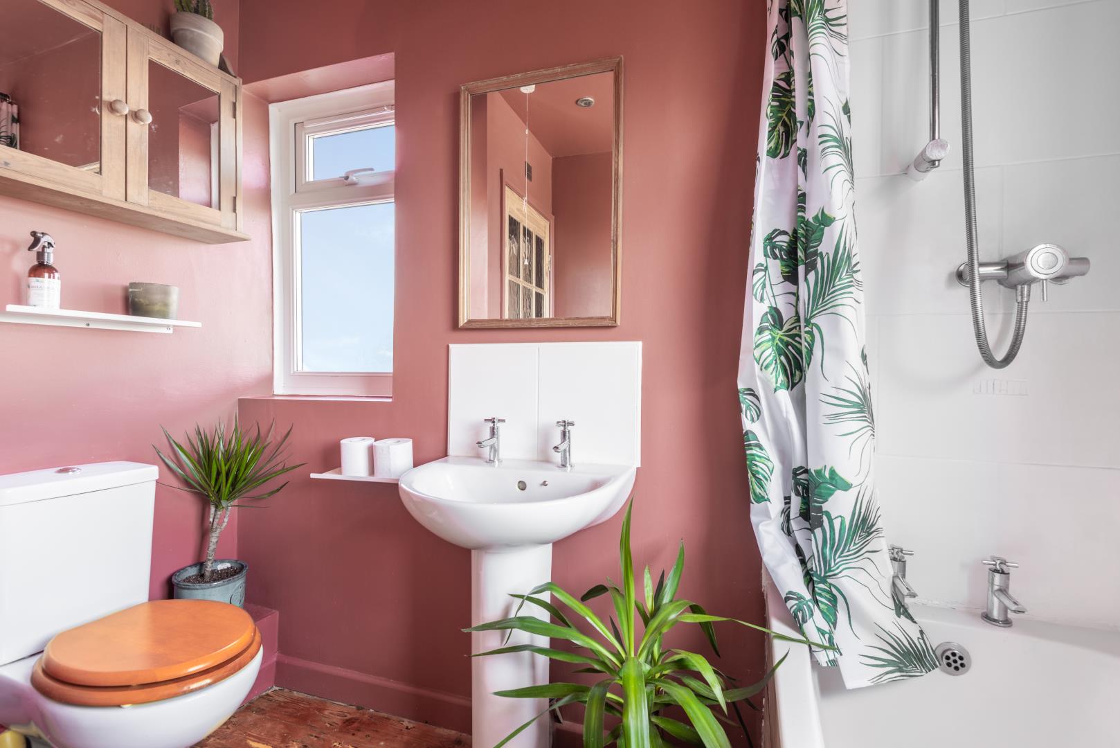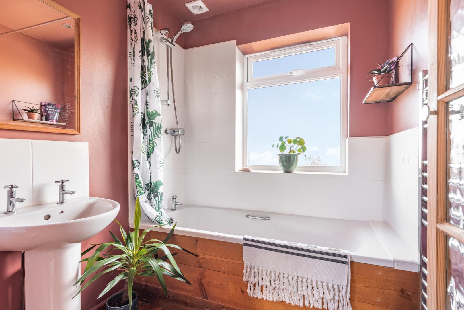 Bathtub. Extractor fan. Family Bathroom. Fitted with a three piece suite. Heated towel rail. Mirrored cabinet. Shower over the bath. Toilet. Shelving. Recently Modernised. Cupboard. Wood Flooring. Windows to side. Windows to rear. Ventilated window. Low voltage lighting. Recessed spot lights. Hardwood Panelled doors. Central heating radiators. Pendant lights.