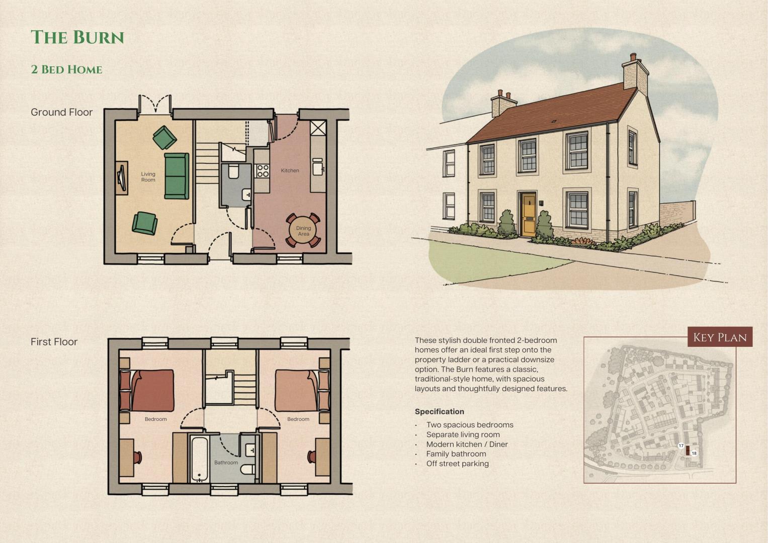 These stylish double fronted 2-bedroom homes offer an ideal first step onto the property ladder or a practical downsize option. The Burn features a classic, traditional-style home, with spacious layouts and thoughtfully designed features.