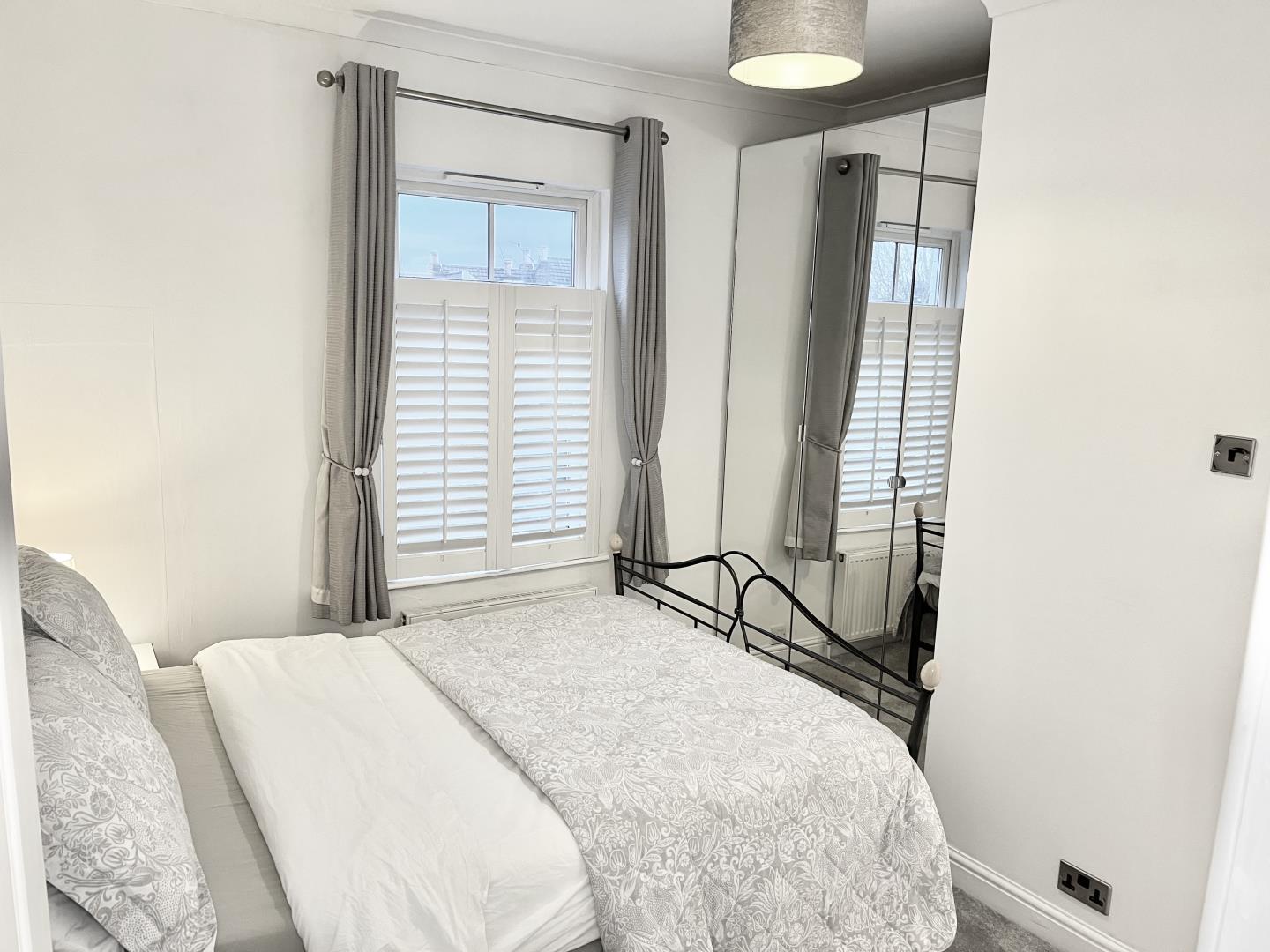 The lounge has cast iron fireplace, traditional column radiator and new plantation shutters.