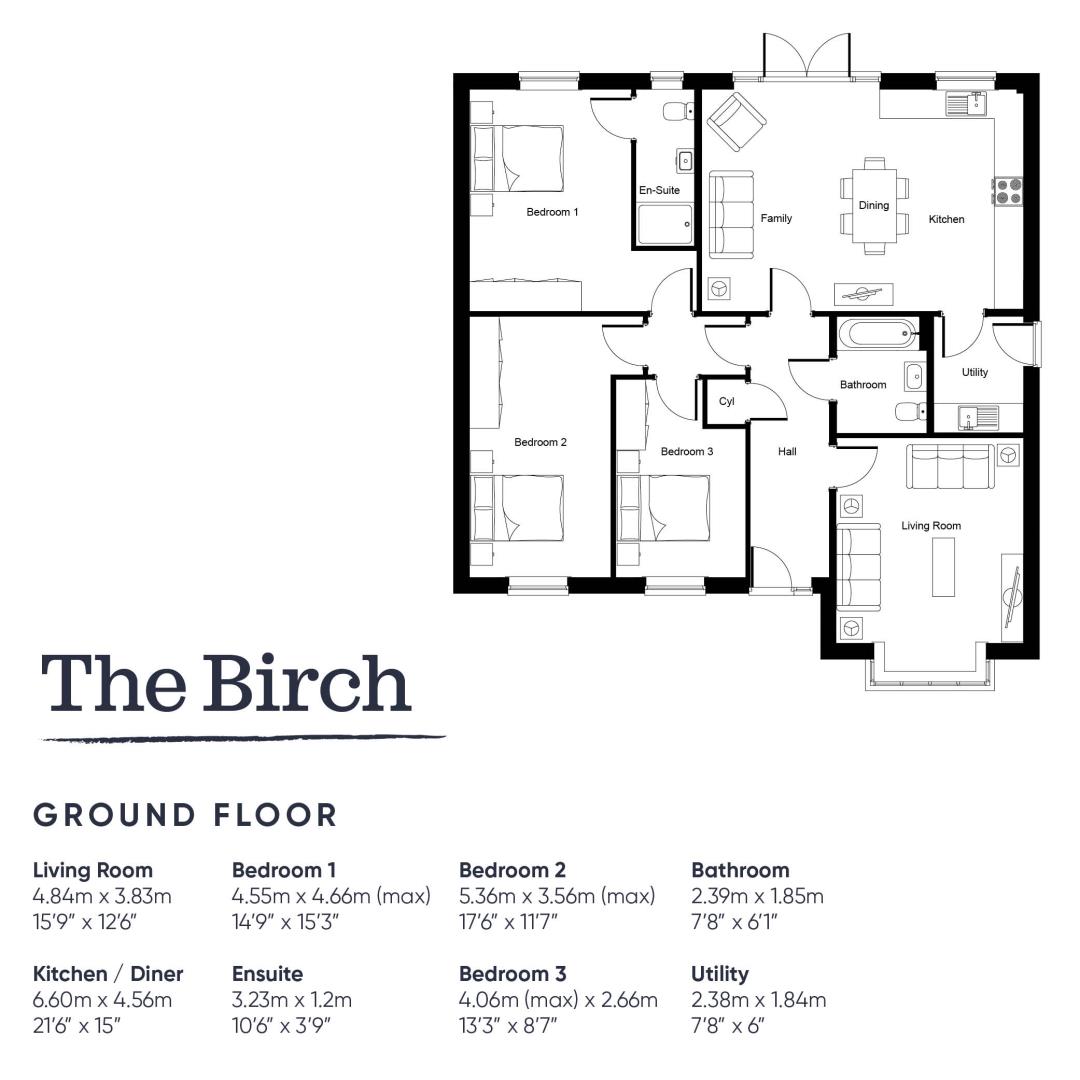 The Birch is a detached bungalow, with open plan kitchen, dining and family area with access to the rear garden through French windows. Utility room. Separate bay fronted living room, three spacious bedrooms, with ensuite to the main bedroom, a family bathroom and single garage.