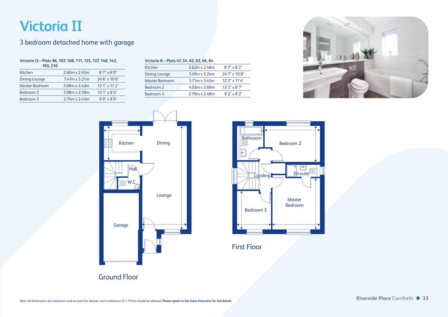 Rowland Homes presents this stylish 3 bedroom detached home with garage. High specification throughout with an open plan lounge/dining area featuring French doors opening out to the back garden, kitchen and a handy downstairs WC. Upstairs there's 3 bedrooms with the master bedroom boasting an en-suite & the bathroom. Ideally located perfect for commuting.<br/> <br/>Plot 54 Victoria B - **Home of the week** Available at £292,995 (900 Sq Ft). £8,789 towards your deposit.* Plus flooring package included*<br/><br/>Plot 66 Victoria B - Available at £294,995 (900 Sq Ft)<br/><br/><br/>Riverside Place, Scotland Road, Carnforth LA5 9RE<br/><br/>Show Homes open<br/>Mon 10.30am - 4.30pm<br/>Thurs 12pm - 5pm<br/>Fri 10.30am - 5pm<br/>Sat & Sun 10.30am - 5.30pm<br/><br/>Riverside Place<br/>Near to Carnforth town centre and created as an entirely self-contained community, Rowland Homes' elegant new development Riverside Place has been planned around a hub of quiet avenues that terminate in a number of cul-de-sacs, so that there is no fast-moving or noisy through traffic within the development.<br/><br/>The entrance to Riverside Place is off nearby Scotland Road, which goes southwards directly into Carnforth town centre just a few minutes away. Scotland Road also leads northwards to the A601(M), a spur road connecting to the M6 motorway.<br/><br/>There is a fantastic choice of properties available at Riverside Place. Many larger properties benefit from garages and private parking areas, whilst other homes enjoy allocated parking spaces.<br/>Property sizes, designs and exterior finishes at Riverside Place reflect the vernacular architectural designs that can be found in and around Carnforth, giving the entire development a mature village-like ambience. Homes display a range of elegant classic architectural features such as traditional brickwork, bay windows and gables as well as period-style doors, porches and bays.<br/><br/>Homes at Riverside Place benefit from private garden areas, and the entire development has been landscaped so as to include trees, shrubs and hedgerows, which attract a wide variety of wildlife throughout the year. There is also a range of facilities available exclusively for residents and their guests; these include a BMX/mountain-bike track, a proposed outdoor gym, a proposed children's play area, extensive open spaces, plus a circular pedestrian path through landscaped grounds.<br/><br/>Carnforth<br/>Perfectly located overlooking both Morecambe Bay and the fells of the Lake District, Carnforth is the perfect place to live if you love the sea and shorelines, mountains and moorland.<br/><br/>Historically, Carnforth came into its own in the 19th century with the coming of the railways, and Carnforth Railway Station now permanently celebrates its crucial role in one of Britain's greatest black-and-white period films, David Lean's 'Brief Encounter', with displays, a heritage centre and a tea-room bistro based on the cafeteria that appeared in the film. Today the station provides rail connections west to Barrow and east to Leeds.<br/><br/>The town features a range of independent shops, as well as traditional pubs and cafés, plus handy supermarkets. In addition, the major towns of Lancaster and Morecambe are just seven miles down the road, whilst the M6 is within easy reach, bringing the Lake District, the Trough of Bowland and the major northern cities of Manchester and Liverpool within easy reach.<br/><br/>Carnforth has both a cricket club and rugby club, both of which welcome players and supporters, and there are at least three golf clubs nearby. Carnforth also has three primary schools and a high school, with nearby Lancaster and Preston both featuring outstanding universities.<br/><br/>*Available on selected plots, terms & conditions apply. Please ask Sales Executive for details. ^Source HBF Report Watt a Save (Jan 25)