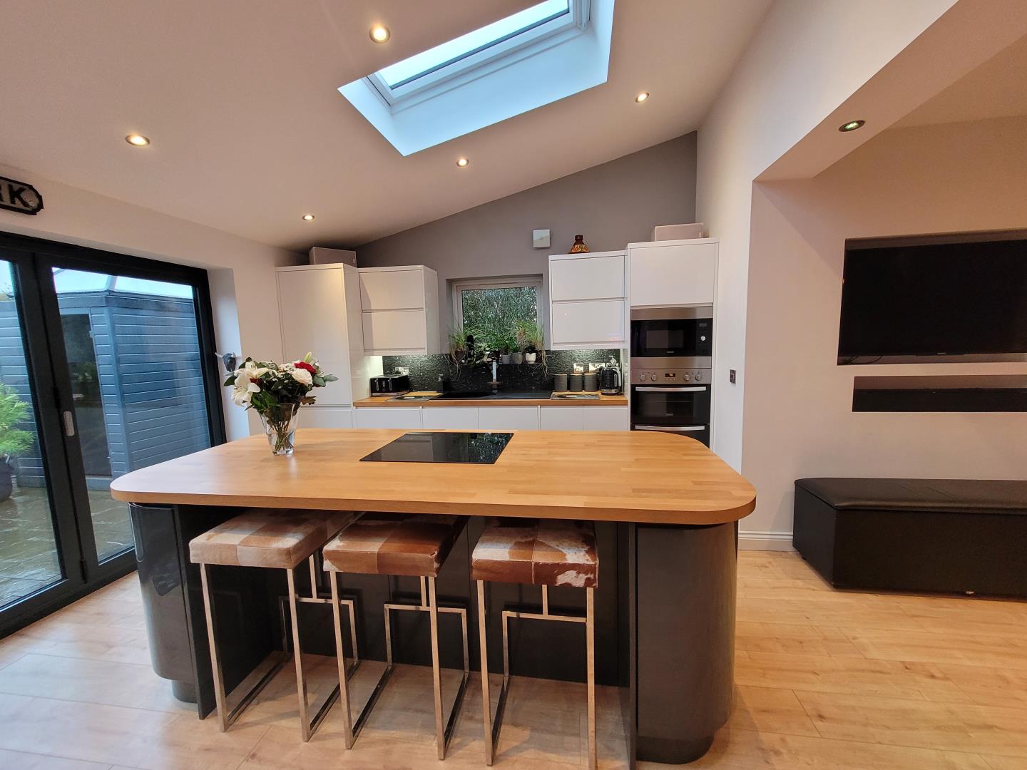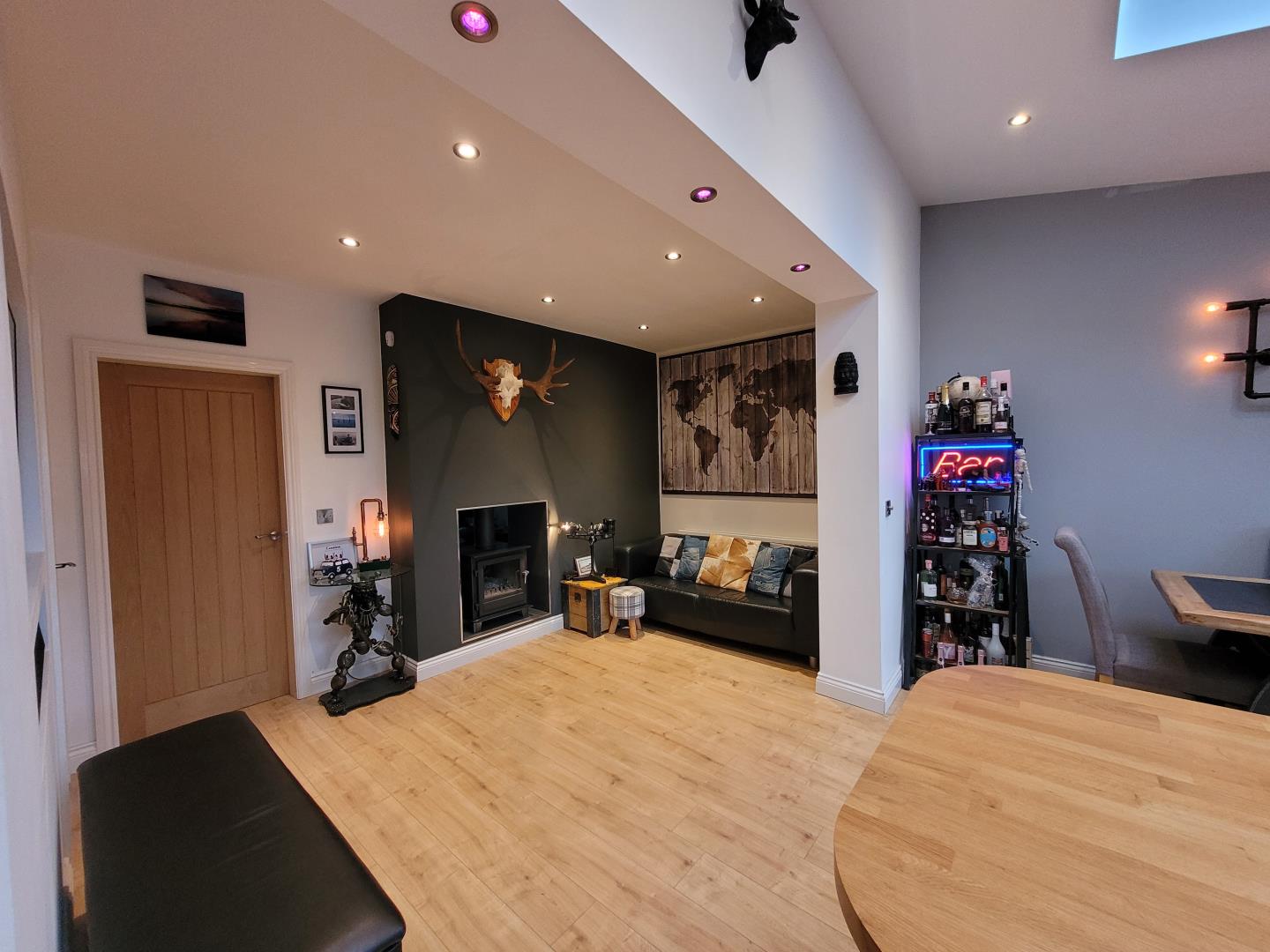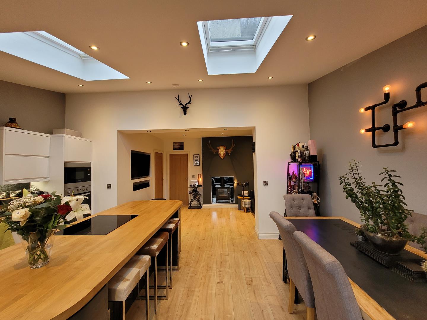 Fitted with a matching range of base & eye level units. Including matching island unit. Including matching breakfast bar. Appliances are Integrated. Counter tops - Wood. Hob - Induction. Kitchen diner. Kitchen / Living Room. Rectangular room. Laminate flooring. Vaulted Ceiling. Wood burner fire. TV aerial point. Central heating radiators. Wall lights. Recessed spot lights. Door to garden. Skylight. Window. Double bi-fold door. Feature fireplace.