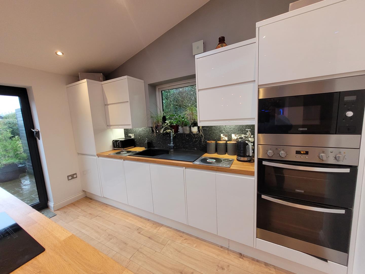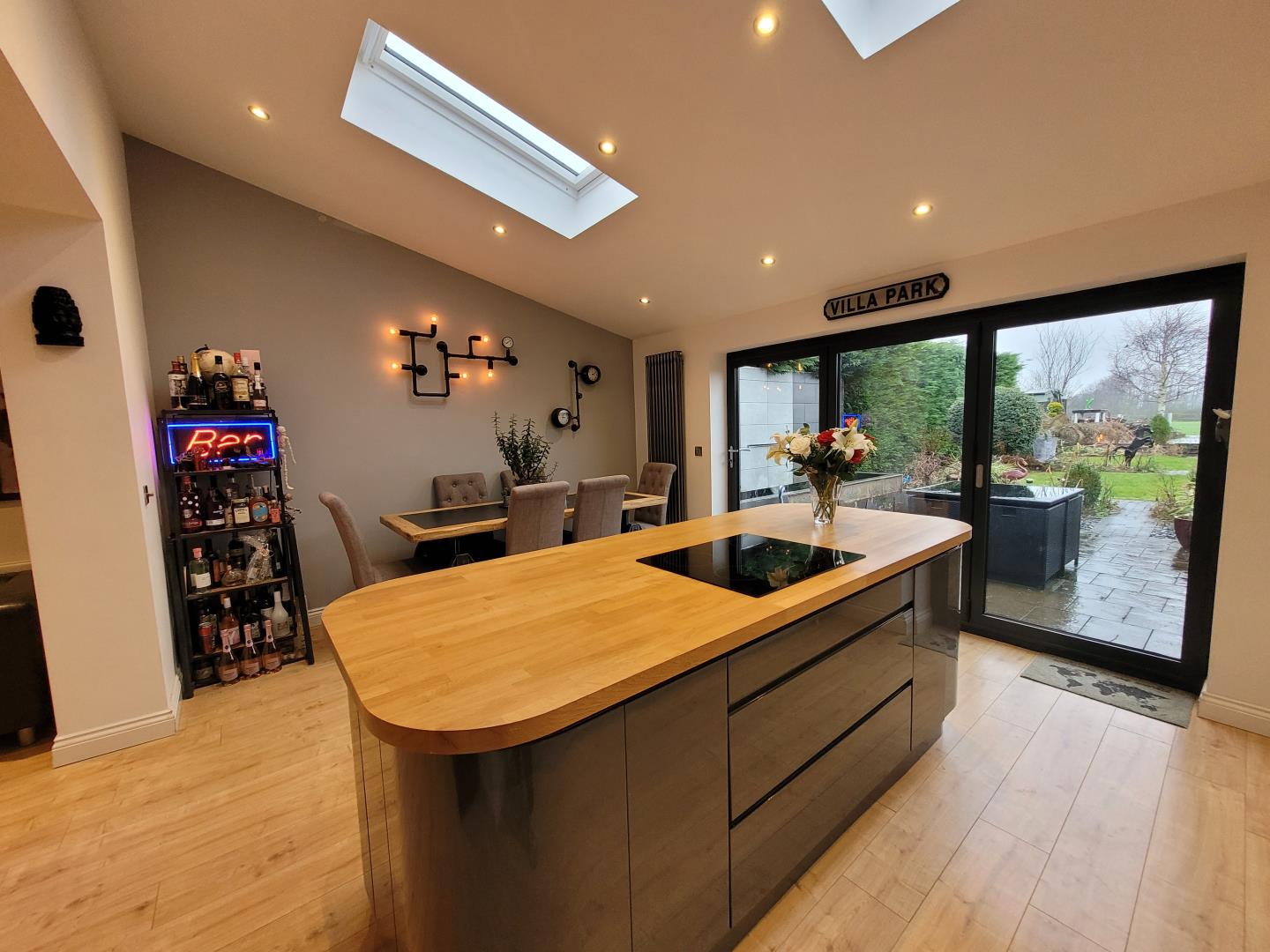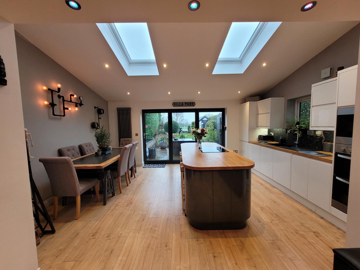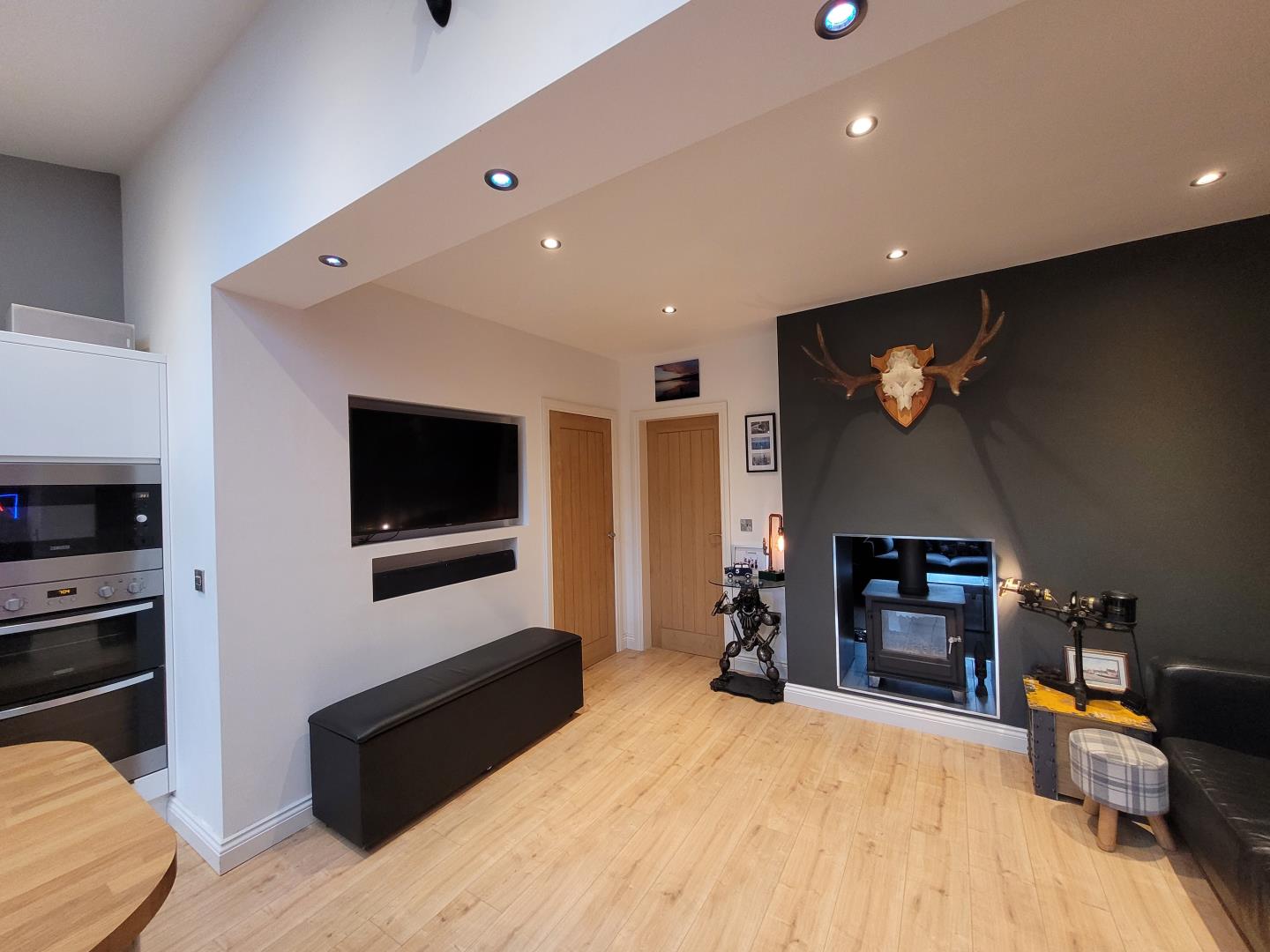 Fitted with a matching range of base & eye level units. Including matching island unit. Including matching breakfast bar. Appliances are Integrated. Counter tops - Wood. Hob - Induction. Kitchen diner. Kitchen / Living Room. Rectangular room. Laminate flooring. Vaulted Ceiling. Wood burner fire. TV aerial point. Central heating radiators. Wall lights. Recessed spot lights. Door to garden. Skylight. Window. Double bi-fold door. Feature fireplace.