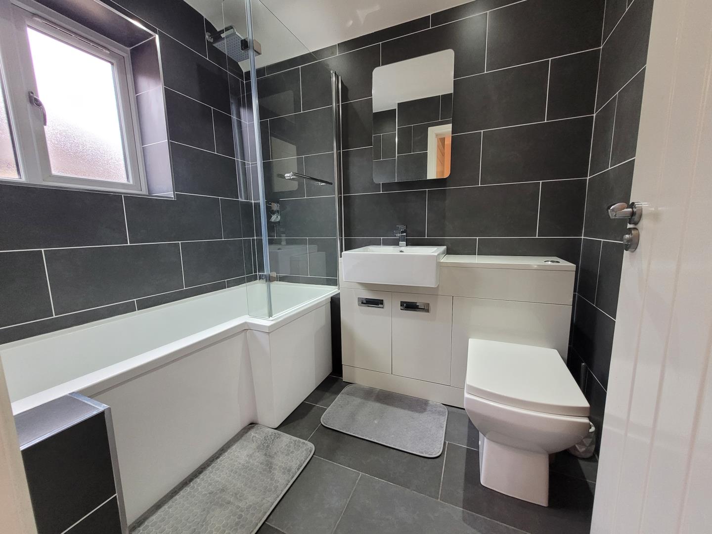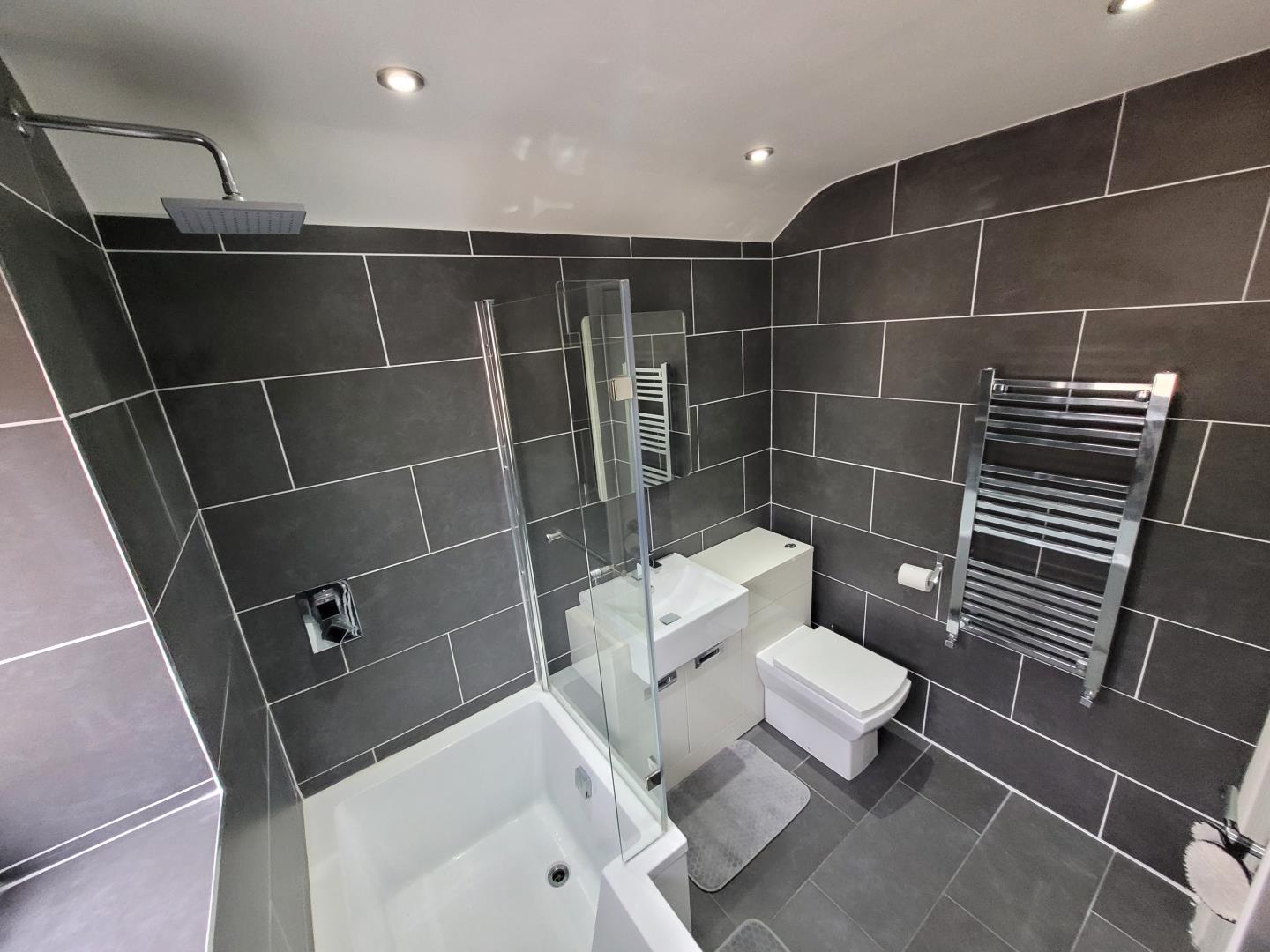 Bathtub. Fitted with a three piece suite. Heated towel rail. Washbasin with mixer tap. Rectangular room. Alcoves with shelving. Porcelain Tiles to floor. Window. Recessed spot lights. Rain fall shower. Toilet.