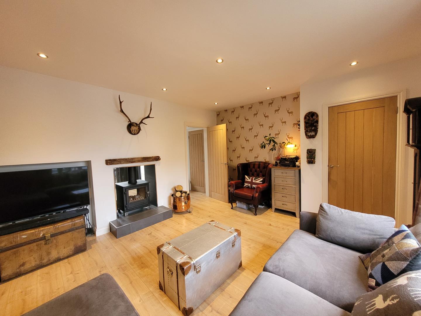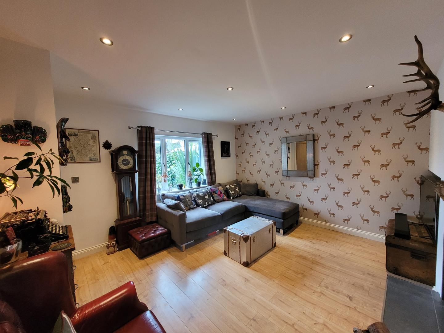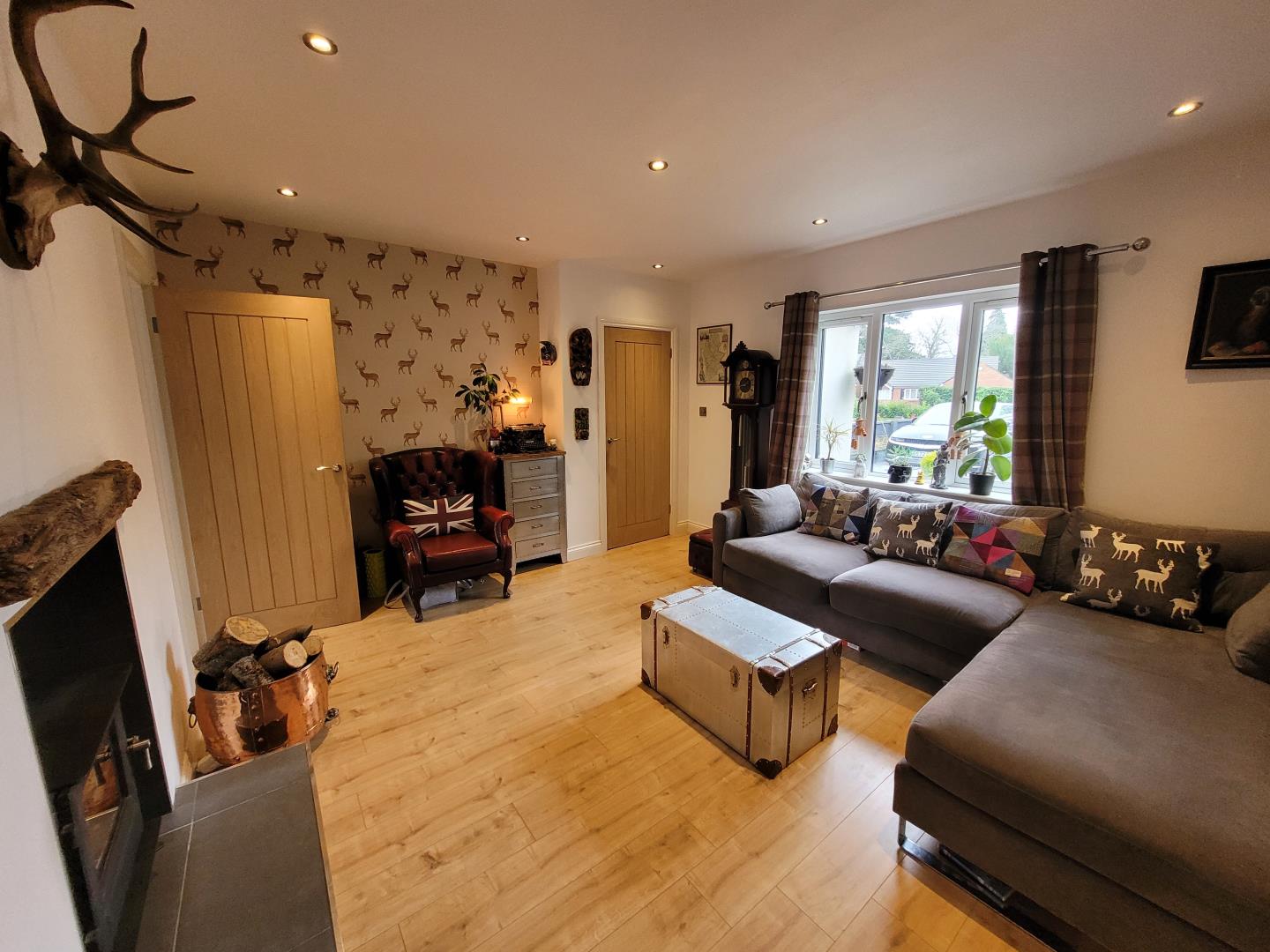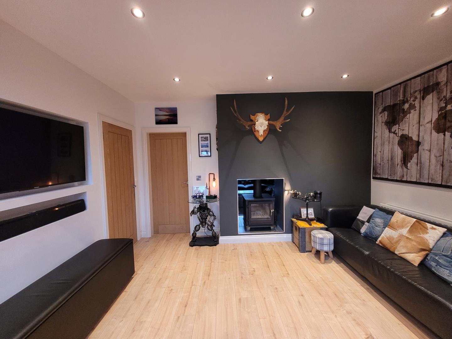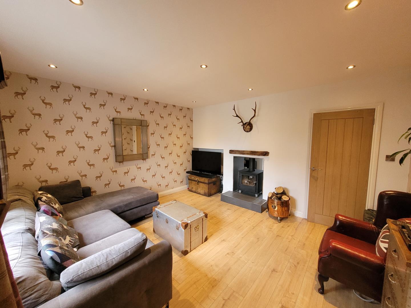 Lounge. Rectangular room. Laminate flooring. Windows to front. Wood burner fire. Feature fireplace. TV aerial point. Telephone socket. Internet point. Central heating radiators. Recessed spot lights.