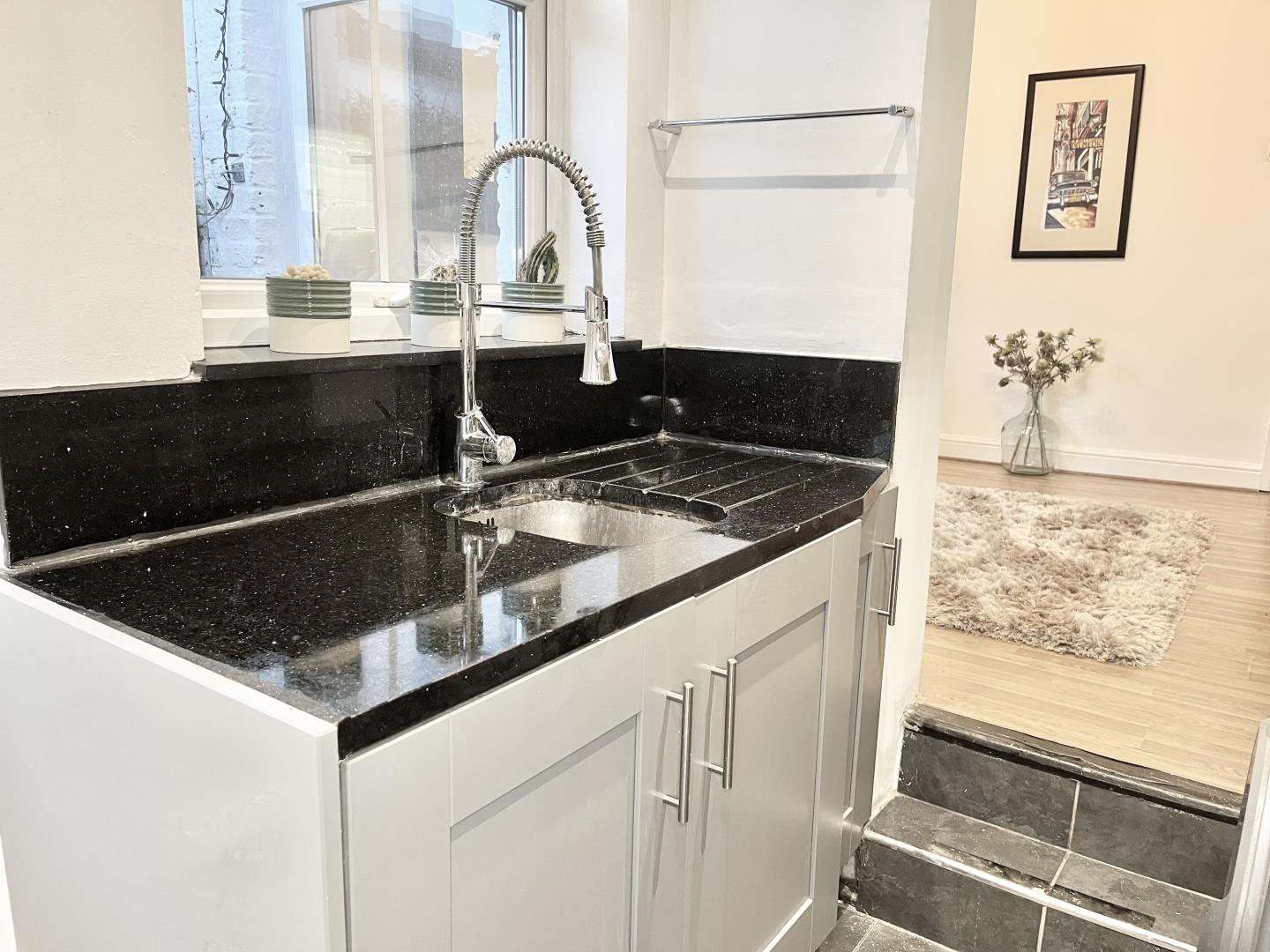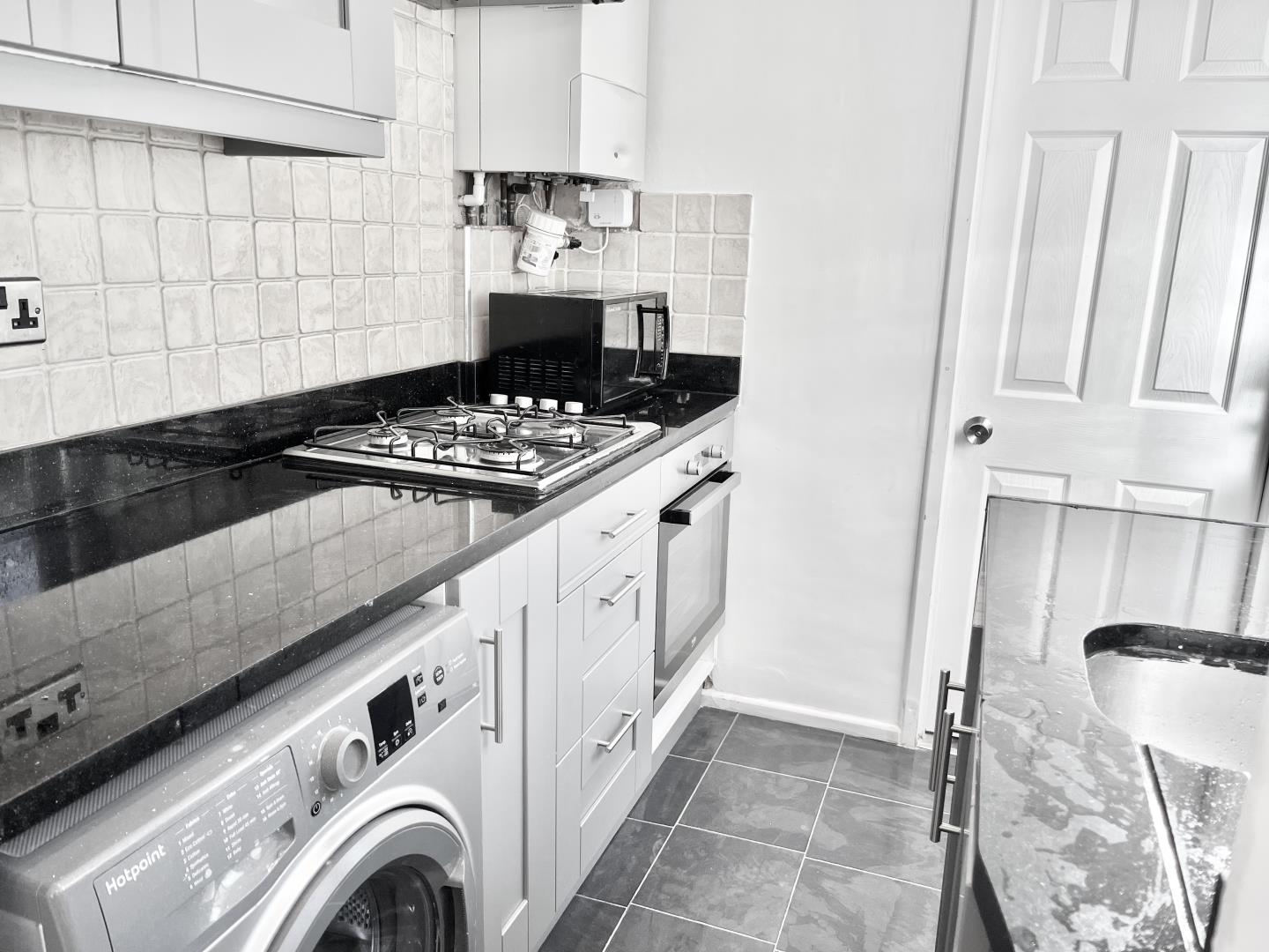 The galley kitchen has BLACK GRANITE worktops, new 4 ring GAS hob, electric oven, sink and washing machine.