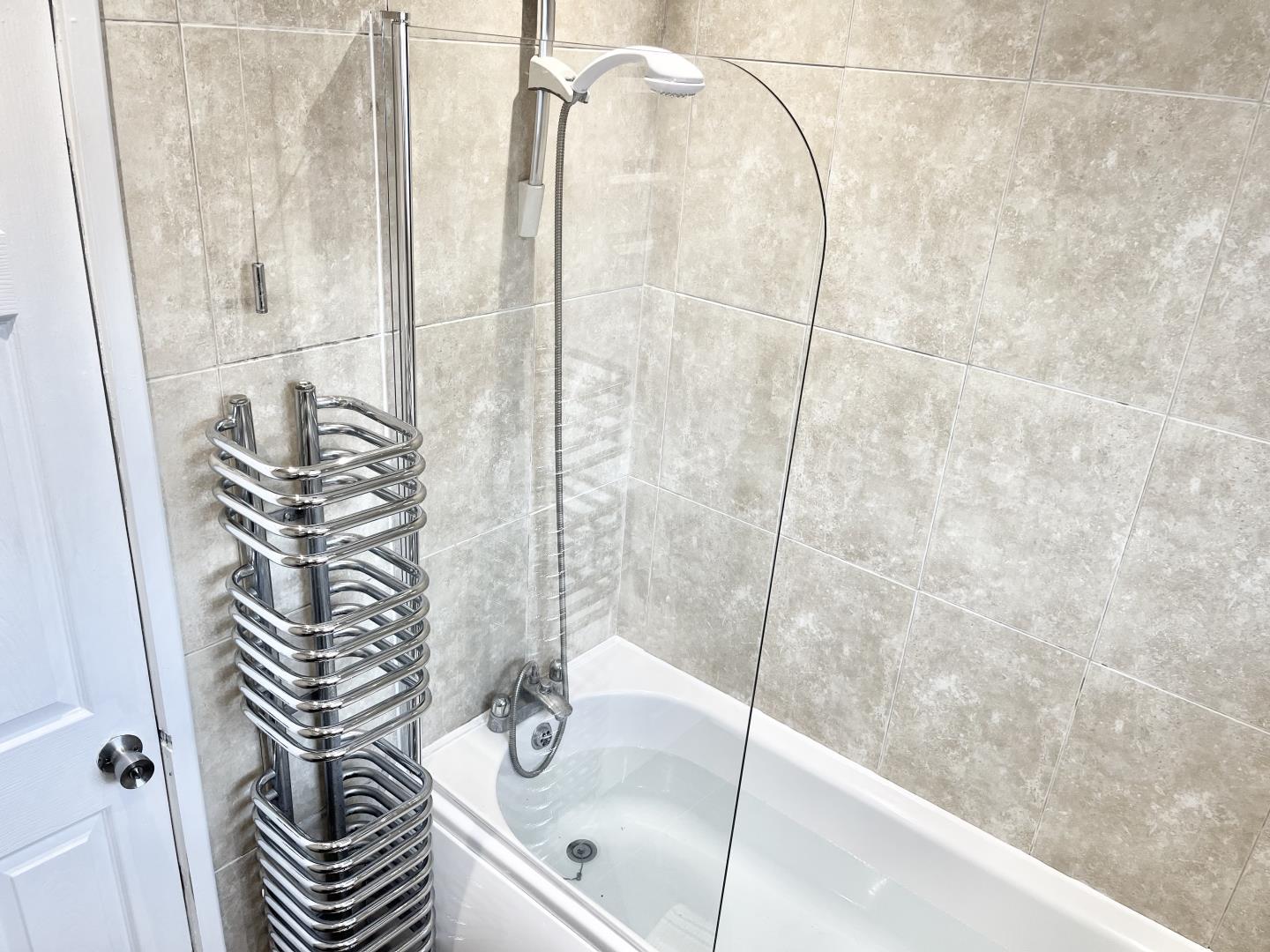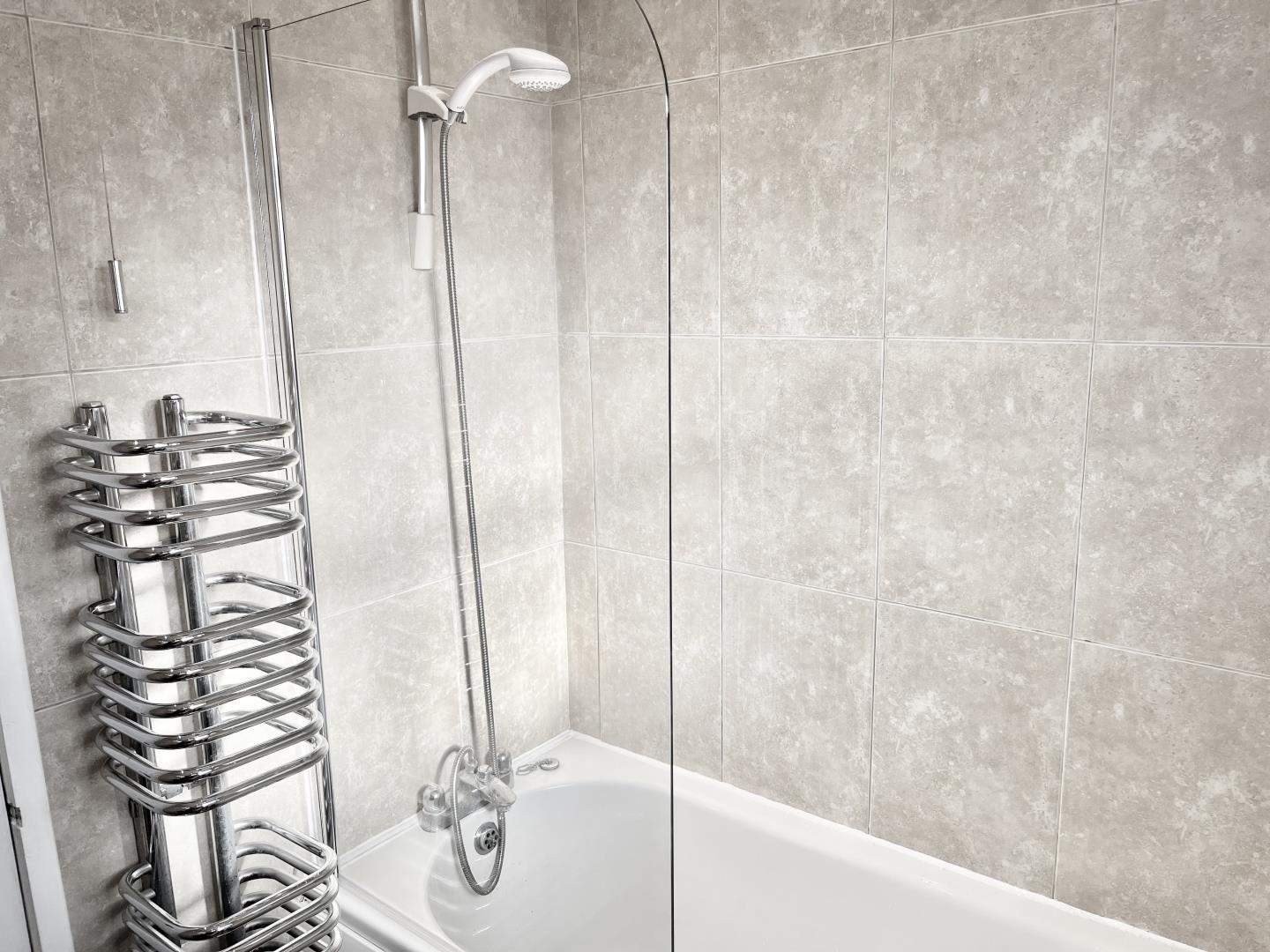 Fitted with a three piece suite. Shower over the bath. Toilet. Washbasin with mixer tap. Square room. Laminate flooring. Windows to rear. Recessed spot lights.