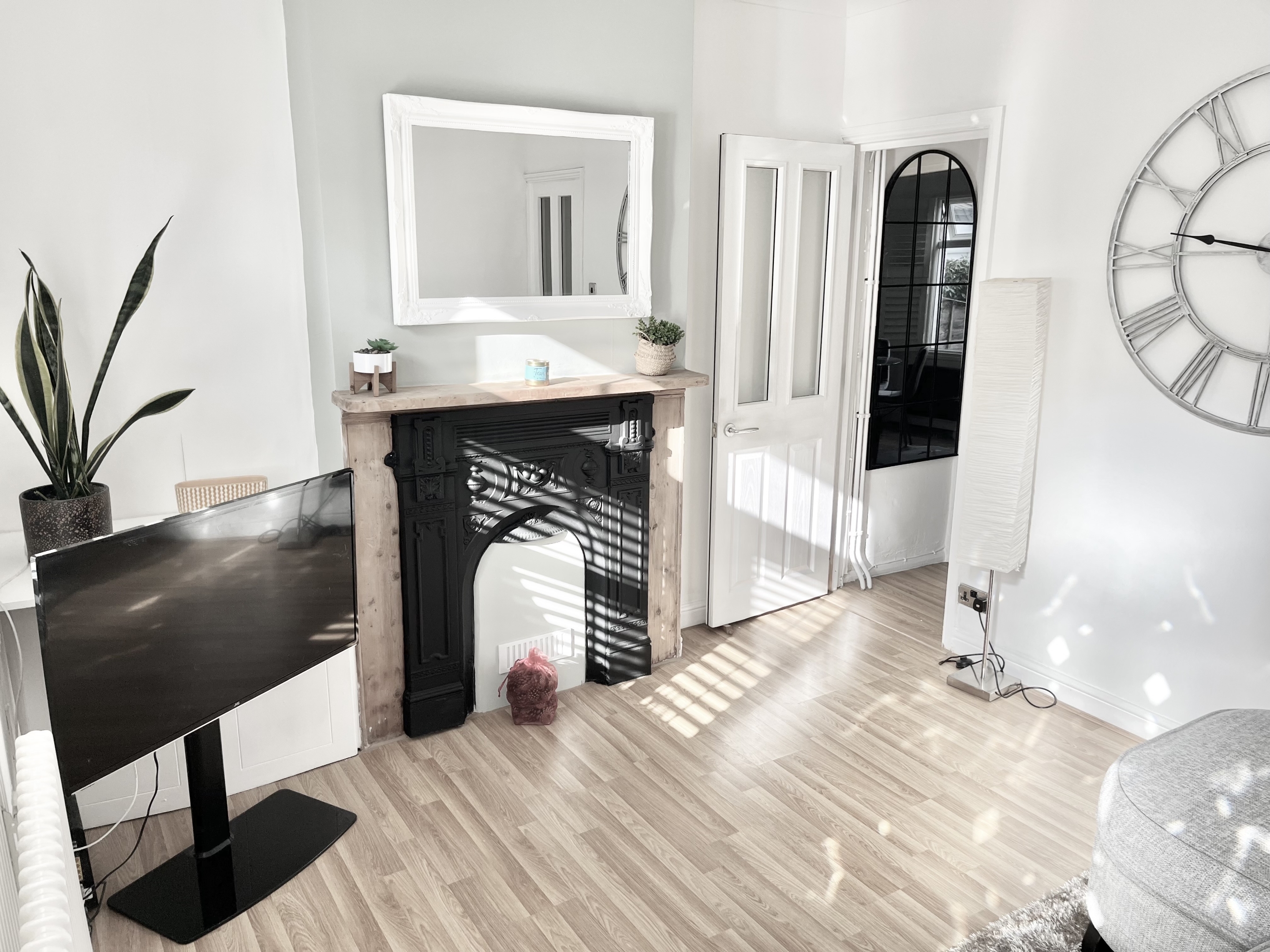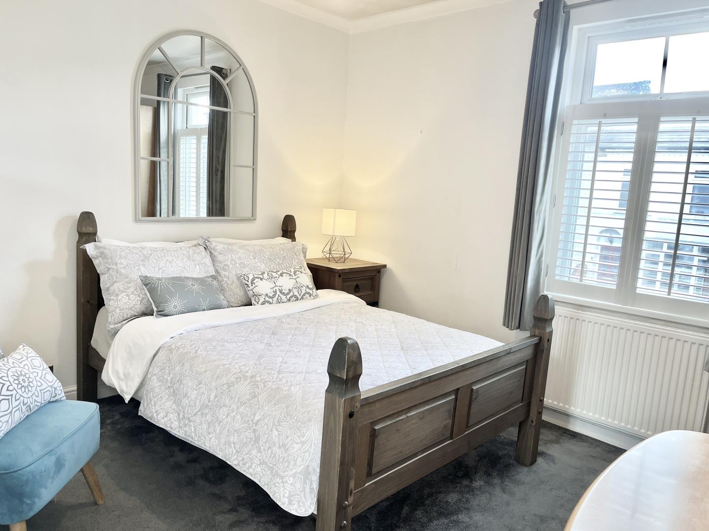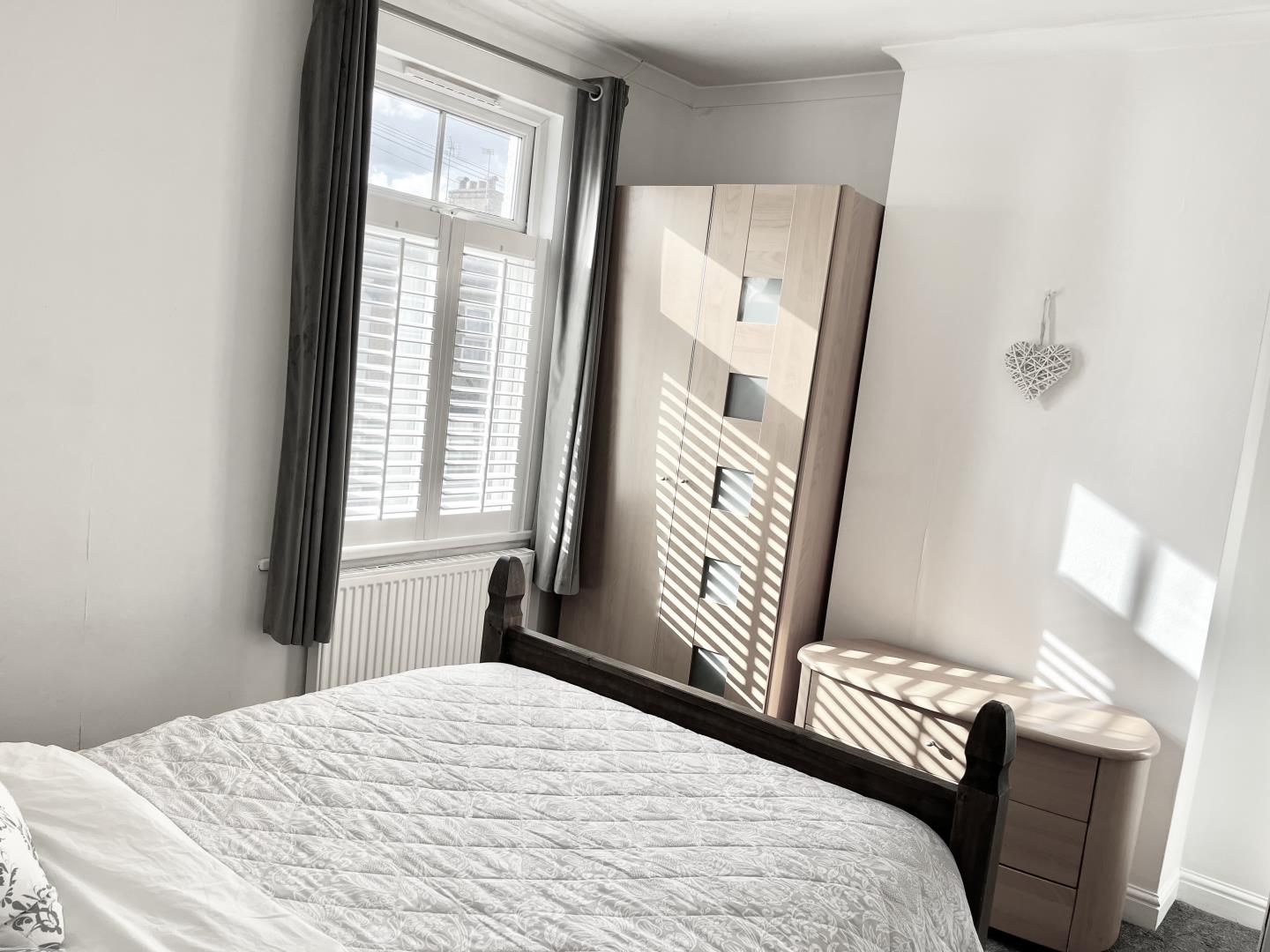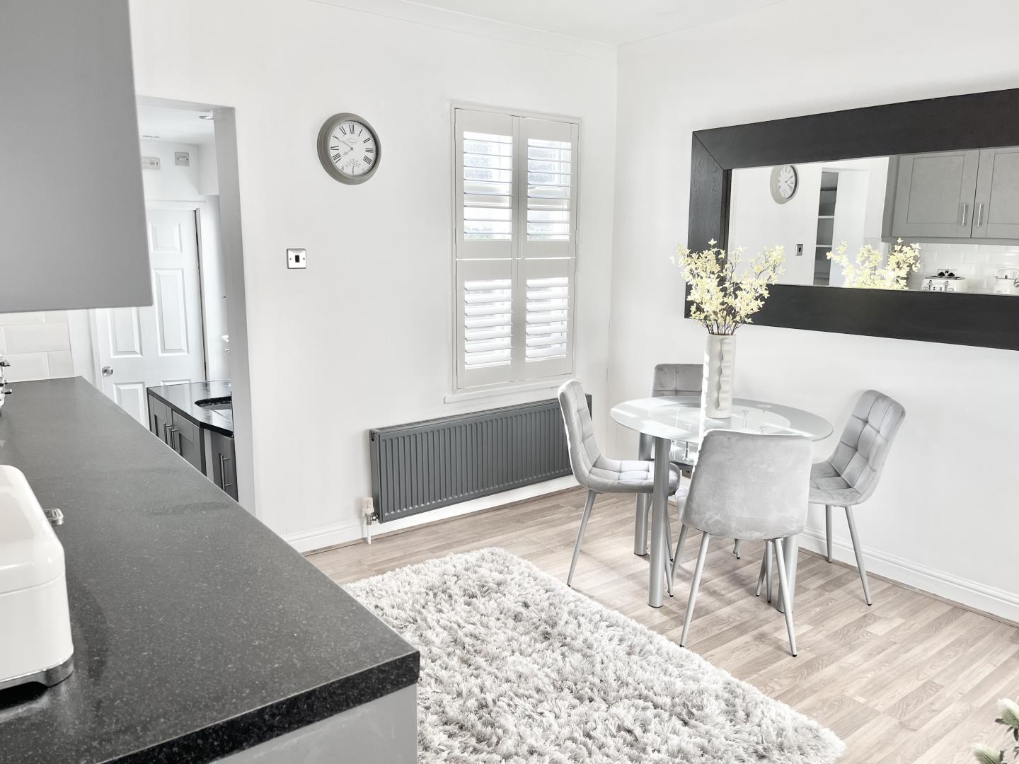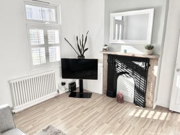 The lounge has cast iron fireplace, traditional column radiator and new plantation shutters.