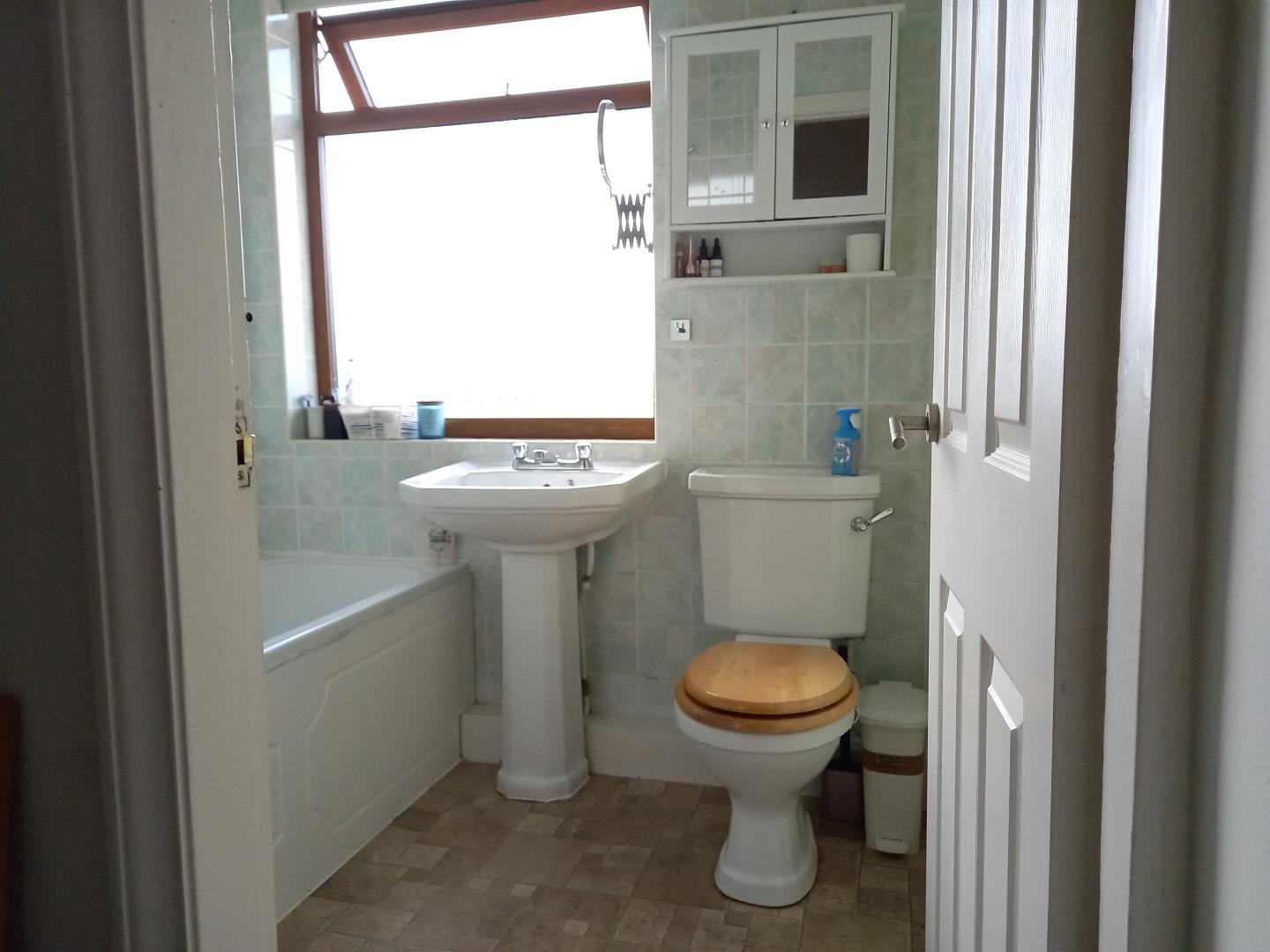 Fitted with a three piece suite. Washbasin with mixer tap. Shower over the bath. Square room. Vinyl flooring. Stained glass window.