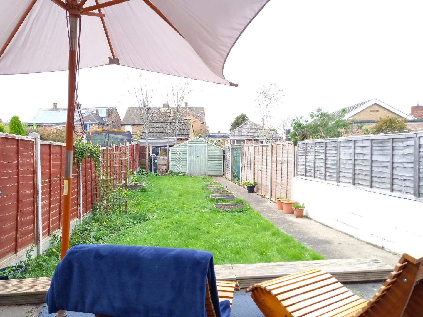 Garden Shed. Lawn. Patio. Vegetable Patch. Hardwood Panelled doors.