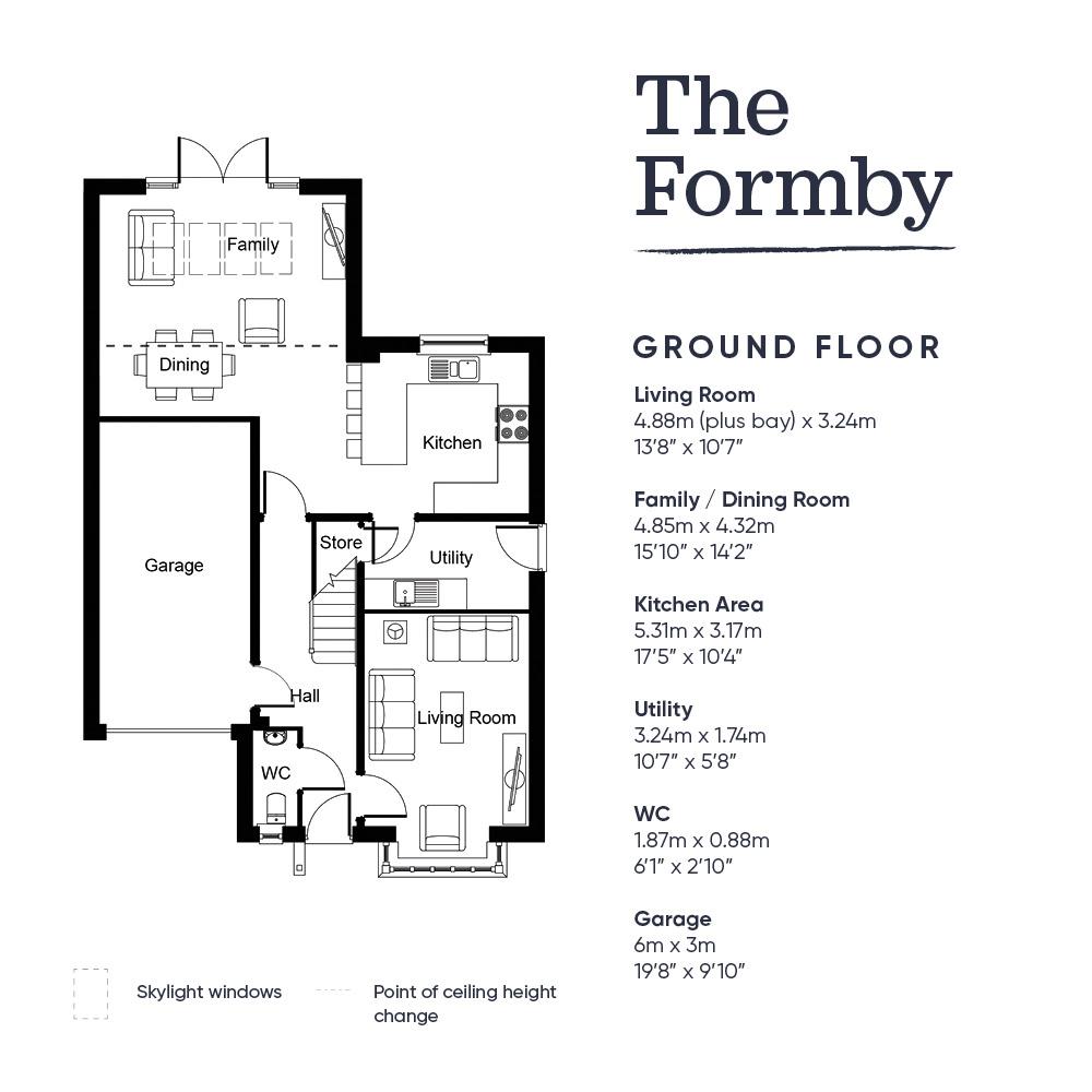 THE FORMBY is a four bedroom detached home with a large contemporary kitchen/dining/family room featuring French doors leading out to the rear garden, feature roof light windows and a stylish breakfast area. There is a separate bay fronted living room, useful utility room and a downstairs WC. Upstairs there are four spacious bedrooms, ensuites to both the main and second bedroom, a family bathroom and ample storage. There is an integral garage.