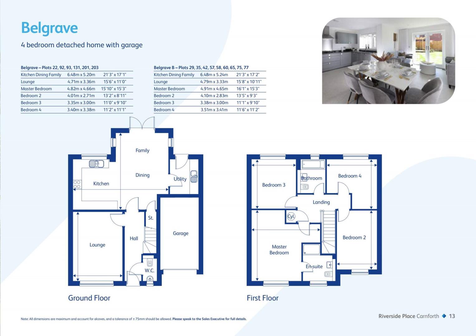 Rowland Homes presents this stunning 4 bedroom detached home with garage. Features an impressive open plan kitchen/dining/family room with doors leading to the garden and a separate lounge. Upstairs there's a beautiful master bedroom with a stylish en-suite, three further bedrooms and a family bathroom. Ideally located perfect for commuting.<br/><br/>Plot 35 The Belgrave B - Available at £412,995 (1410 Sq Ft) - Ready to move into. House to Sell? Ask about our Part Exchange Scheme.* Plus includes over £10,900 worth of upgrades.* View Today!<br/><br/>Plot 60 The Belgrave B - Available at £412,995 (1410 Sq Ft)<br/><br/>Plot 29 The Belgrave B - Available at £412,995 (1410 Sq Ft) <br/><br/><br/>Riverside Place, Scotland Road, Carnforth LA5 9RE<br/><br/>Show Homes open<br/>Mon 10.30am - 4.30pm<br/>Thurs 12pm - 5pm<br/>Fri 10.30am - 5pm<br/>Sat & Sun 10.30am - 5.30pm<br/><br/>Riverside Place<br/>Near to Carnforth town centre and created as an entirely self-contained community, Rowland Homes' elegant new development Riverside Place has been planned around a hub of quiet avenues that terminate in a number of cul-de-sacs, so that there is no fast-moving or noisy through traffic within the development.<br/><br/>The entrance to Riverside Place is off nearby Scotland Road, which goes southwards directly into Carnforth town centre just a few minutes away. Scotland Road also leads northwards to the A601(M), a spur road connecting to the M6 motorway. <br/><br/>There is a fantastic choice of properties available at Riverside Place. Many larger properties benefit from garages and private parking areas, whilst other homes enjoy allocated parking spaces. Property sizes, designs and exterior finishes at Riverside Place reflect the vernacular architectural designs that can be found in and around Carnforth, giving the entire development a mature village-like ambience. Homes display a range of elegant classic architectural features such as traditional brickwork, bay windows and gables as well as period-style doors, porches and bays.<br/><br/>Homes at Riverside Place benefit from private garden areas, and the entire development has been landscaped so as to include trees, shrubs and hedgerows, which attract a wide variety of wildlife throughout the year. There is also a range of facilities available exclusively for residents and their guests; these include a BMX/mountain-bike track, a proposed outdoor gym, a proposed children's play area, extensive open spaces, plus a circular pedestrian path through landscaped grounds.<br/><br/>Carnforth<br/><br/>Perfectly located overlooking both Morecambe Bay and the fells of the Lake District, Carnforth is the perfect place to live if you love the sea and shorelines, mountains and moorland.<br/><br/>Historically, Carnforth came into its own in the 19th century with the coming of the railways, and Carnforth Railway Station now permanently celebrates its crucial role in one of Britain's greatest black-and-white period films, David Lean's 'Brief Encounter', with displays, a heritage centre and a tea-room bistro based on the cafeteria that appeared in the film. Today the station provides rail connections west to Barrow and east to Leeds.<br/><br/>The town features a range of independent shops, as well as traditional pubs and cafés, plus handy supermarkets. In addition, the major towns of Lancaster and Morecambe are just seven miles down the road, whilst the M6 is within easy reach, bringing the Lake District, the Trough of Bowland and the major northern cities of Manchester and Liverpool within easy reach.<br/><br/>Carnforth has both a cricket club and rugby club, both of which welcome players and supporters, and there are at least three golf clubs nearby. Carnforth also has three primary schools and a high school, with nearby Lancaster and Preston both featuring outstanding universities.<br/><br/>*Available on selected plots, terms and conditions apply. Please ask Sales Executive for details. ^HBF Report Watt a Save (Jan 25)