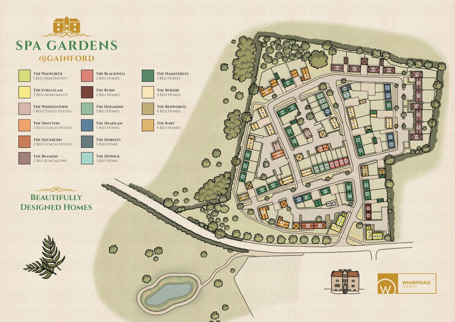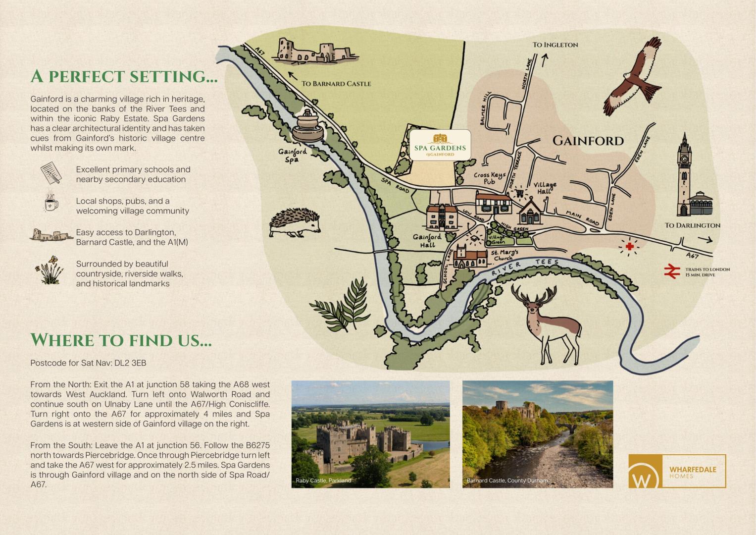 **Our on-site sales office is now open Thursday to Monday, 10:30am–5:00pm. Feel free to drop in.**<br/><br/>These stylish four-bedroom homes occupy PRIME scenic spots within Spa Gardens, boasting SPACIOUS gardens and HIGH-SPEC finishes throughout. The ground floor features open-plan interiors, perfect for modern living.<br/><br/>A home for you<br/>Whether you’re stepping onto the property ladder, growing your family, or seeking a tranquil retreat, Spa Gardens offers a collection of 1, 2, 3 and 4 bedroom homes and apartments, including a range of 2 bedroom bungalows. Each home is carefully designed to reflect the character of the local area while offering all the benefits of energy-efficient, contemporary<br/>living.<br/><br/>Why Choose a Wharfedale Home?<br/>With a longstanding reputation for building quality homes in desirable locations, Wharfedale Homes brings a personal, thoughtful approach to every development. Wharfedale Homes has appointed a specialist team to support the delivery of this bespoke development with a clear identity and attention to detail, providing a special place to befit its surroundings.<br/><br/>A perfect setting...<br/>Gainford is a charming village rich in heritage, located on the banks of the River Tees and within the iconic Raby Estate. Spa Gardens has a clear architectural identity and has taken cues from Gainford’s historic village centre whilst making its own mark.<br/><br/>Where to find us...<br/>Postcode for Sat Nav: DL2 3EB<br/><br/>From the North: Exit the A1 at junction 58 taking the A68 west towards West Auckland. Turn left onto Walworth Road and continue south on Ulnaby Lane until the A67/High Coniscliffe. Turn right onto the A67 for approximately 4 miles and Spa Gardens is at western side of Gainford village on the right.<br/>From the South: Leave the A1 at junction 56. Follow the B6275 north towards Piercebridge. Once through Piercebridge turn left and take the A67 west for approximately 2.5 miles. Spa Gardens<br/>is through Gainford village and on the north side of Spa Road/ A67.<br/><br/><br/><br/><br/><br/><br/>