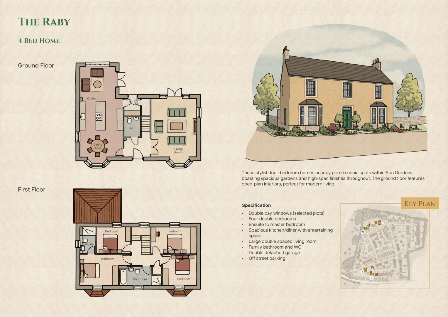 These stylish four-bedroom homes occupy PRIME scenic spots within Spa Gardens, boasting SPACIOUS gardens and HIGH-SPEC finishes throughout. The ground floor features open-plan interiors, perfect for modern living.