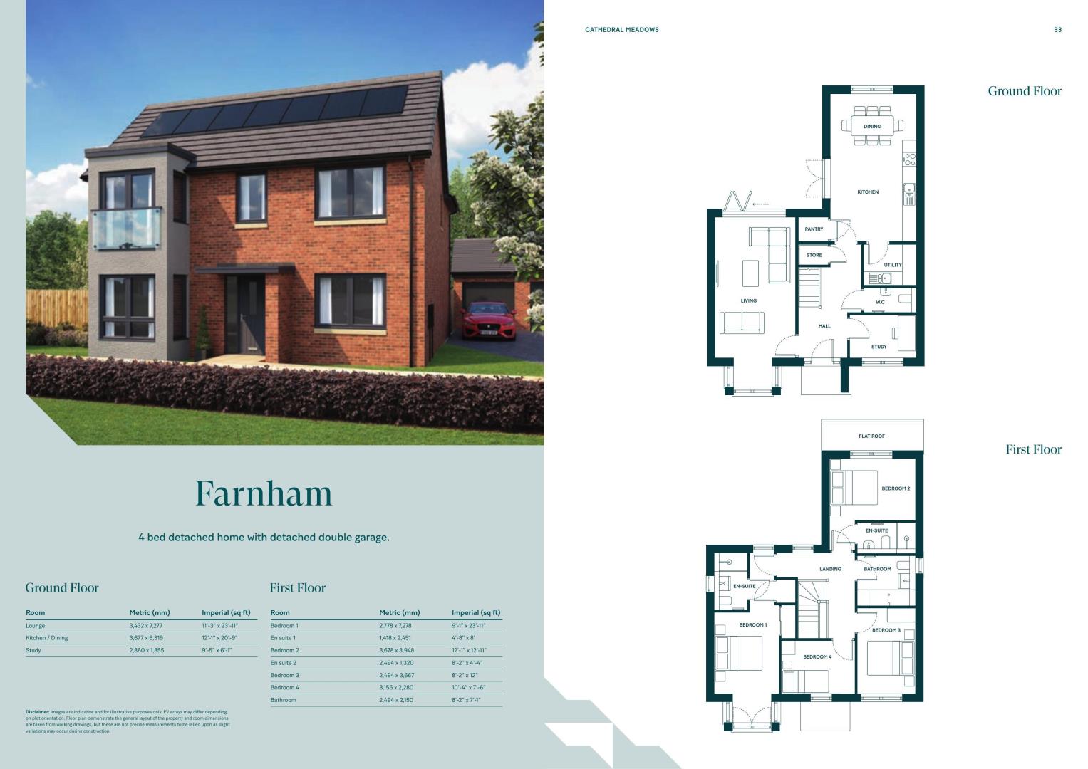 The Farnham is our most spacious four bedroom property with a generous living space opening onto the private garden with bi-fold doors and a stunning bay window.<br/>The large kitchen dining room includes a utility room and pantry, with French doors which open onto the garden. A generous entrance hall, study and WC are also on the ground floor. The first floor has four bedrooms, two with en-suites and a family bathroom. The principal bedroom features a large bay window. There is also a detached double garage and driveway parking.<br/><br/>Cathedral Meadows is perfectly placed for commuting, shopping and exploring the natural beauty of the North East. And with the bright lights of Newcastle, Sunderland and Teesside on your doorstep, you only have to hop on the A1 to discover the region’s art, culture and creativity.<br/>Alternatively, detour to Durham Station and catch The East Coast Main Line to Edinburgh, Glasgow, Newcastle, Leeds, Manchester, Birmingham or even London.<br/>Ready to travel farther afield? Newcastle International Airport and Teesside International Airport are both within a 30-mile drive.