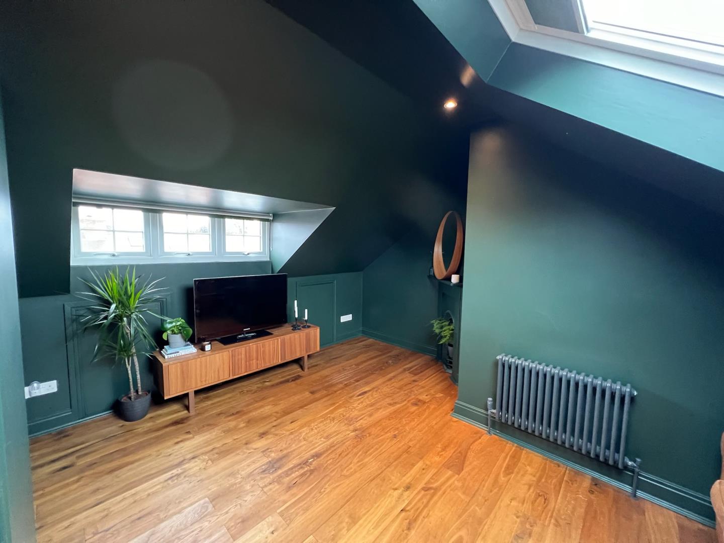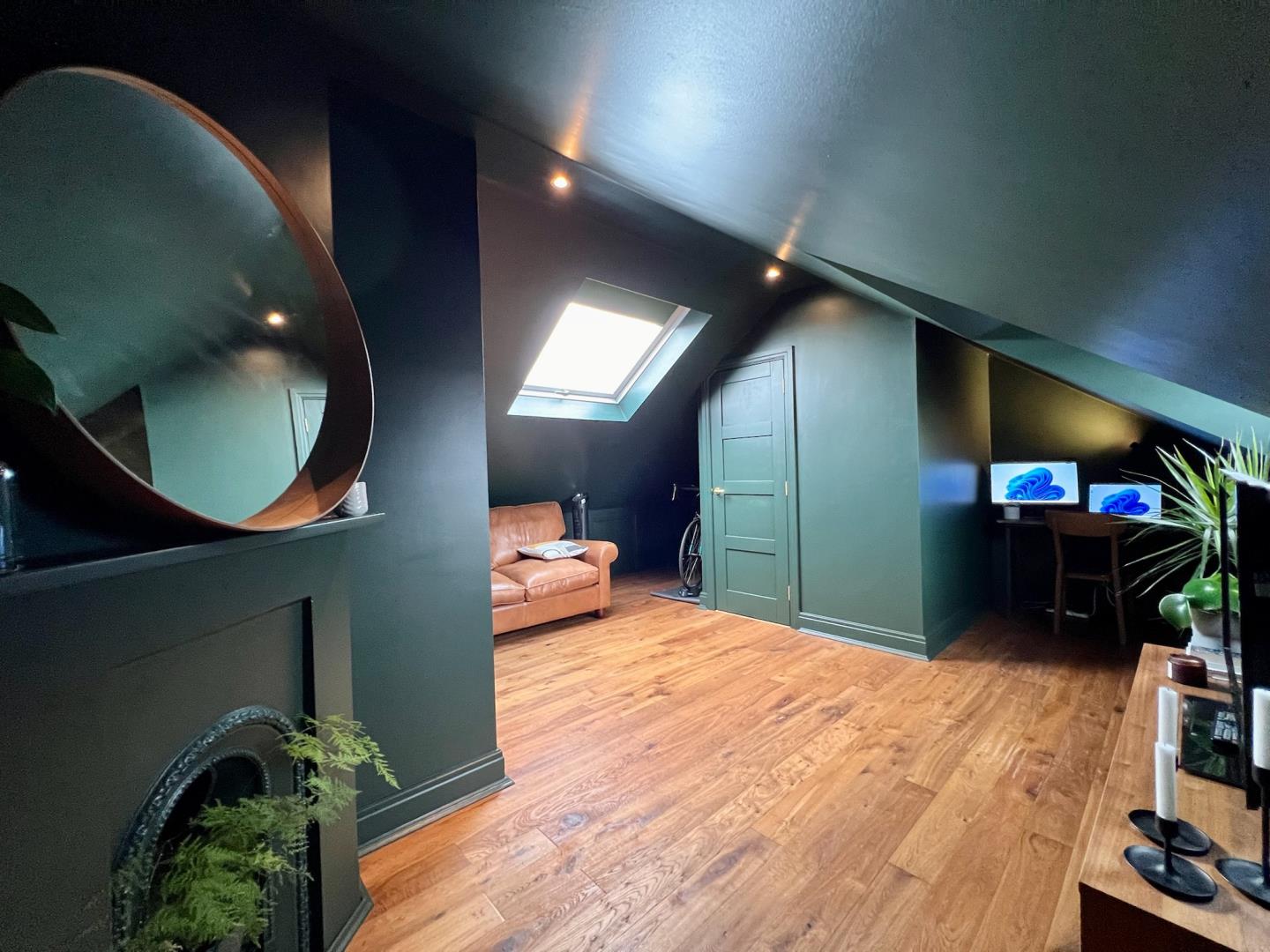 Unusual shaped room. Wood Flooring. Entrance door. Windows to rear. Windows to front. Velux window. Decorative fireplace. Central heating radiators. Recessed spot lights. Dimmer controlled lights.