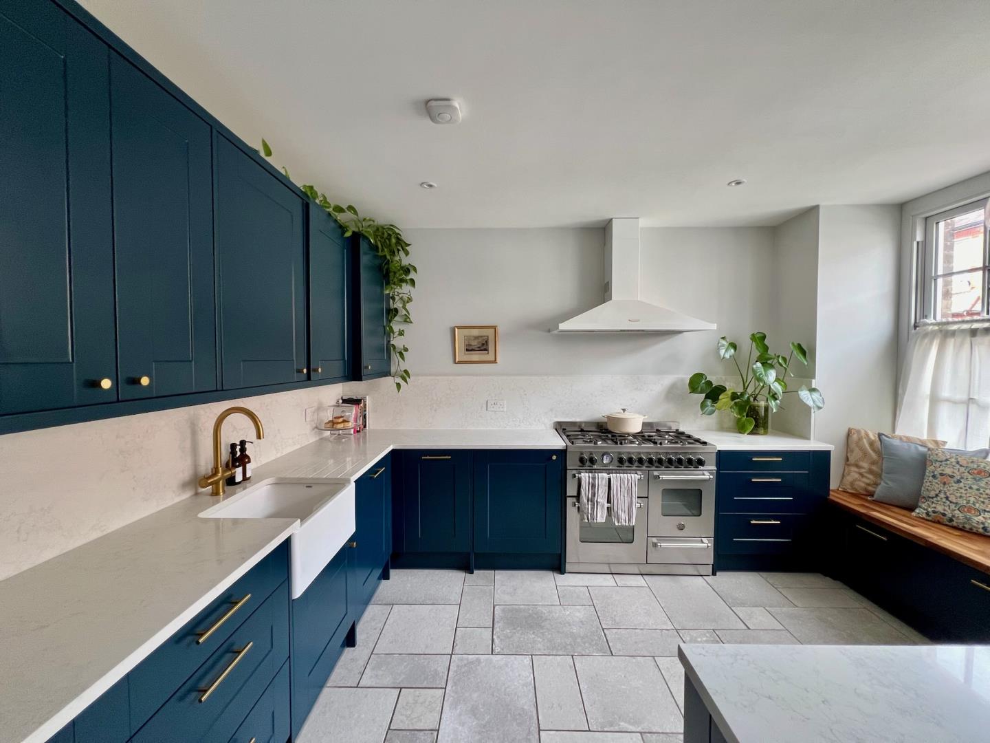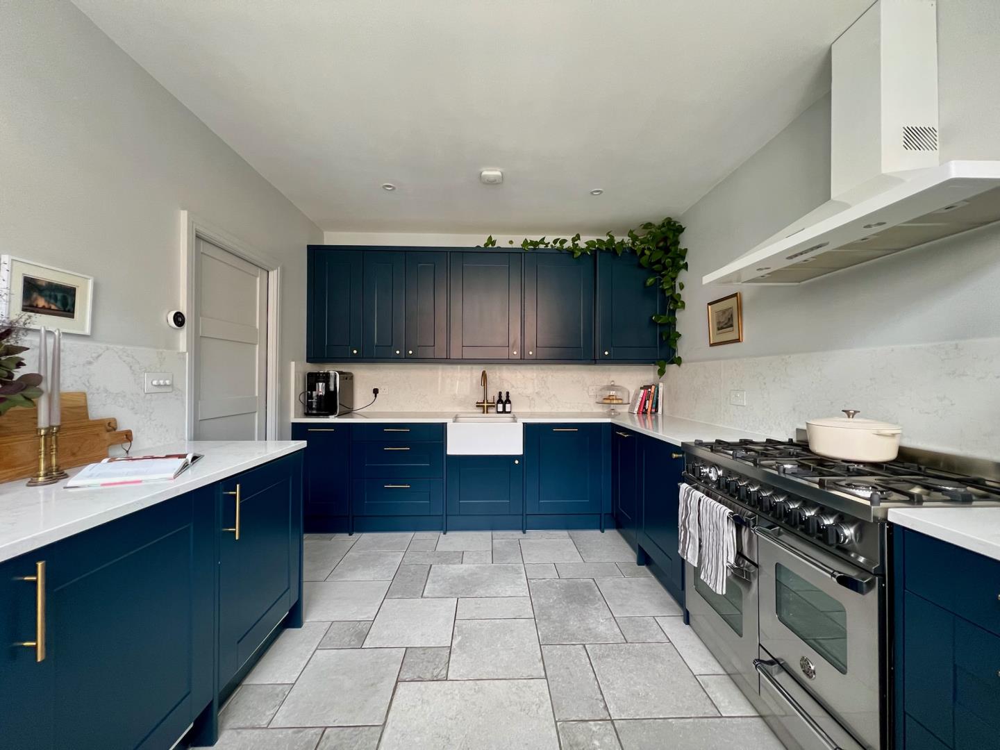 Fitted with a matching range of base & eye level units. Appliances are Integrated. Counter tops - Quartz. Dishwasher. Extractor hood Overhead. Fully fitted kitchen. Hob - Gas. Range cooker. Tumble Dryer. Washing machine. Square room. Underfloor heating. Storage. Shelving. Recently Modernised. Cupboard. Ceramic floor tiles. Sliding door. Windows to front. Window with window seat. Recessed spot lights. Pendant lights. LED strip light. Dimmer controlled lights.