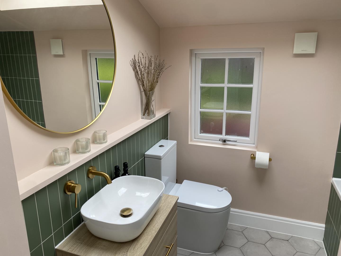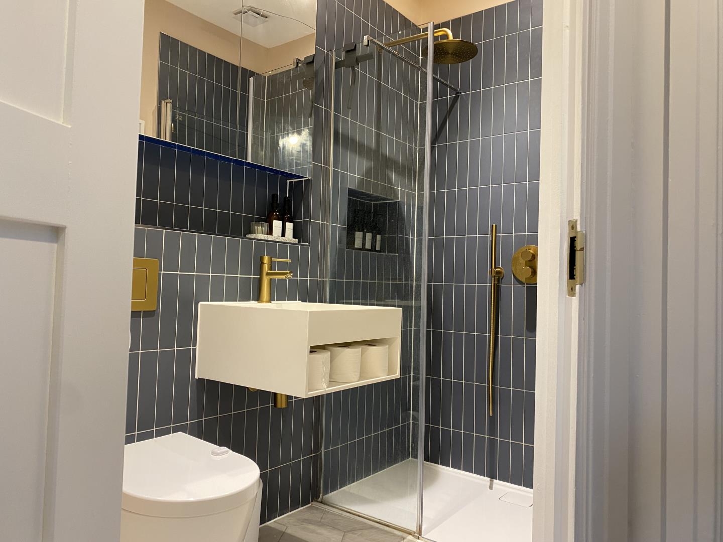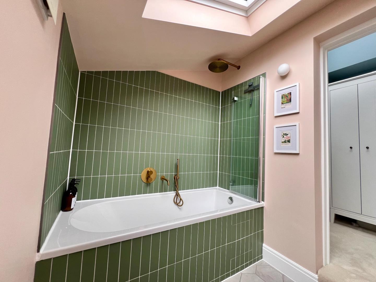 En-suite Bathroom. Bathtub. Extractor fan. Shower over the bath. Toilet. Washbasin with mixer tap. Rectangular room. Underfloor heating. Storage. Shelving. Recently Modernised. Ceramic floor tiles. Door to front. Window. Skylight. Wall lights.