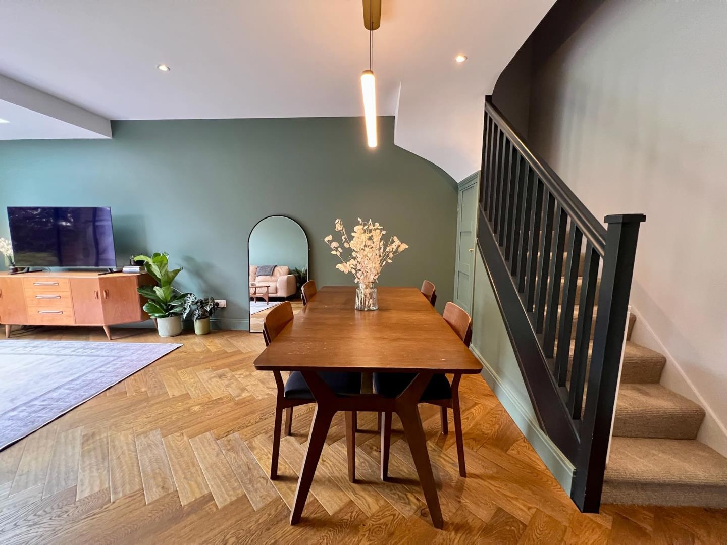 Dining area. Rectangular room. Underfloor heating. Recently Modernised. Wood Flooring. Pendant lights. Dimmer controlled lights. Recessed spot lights.