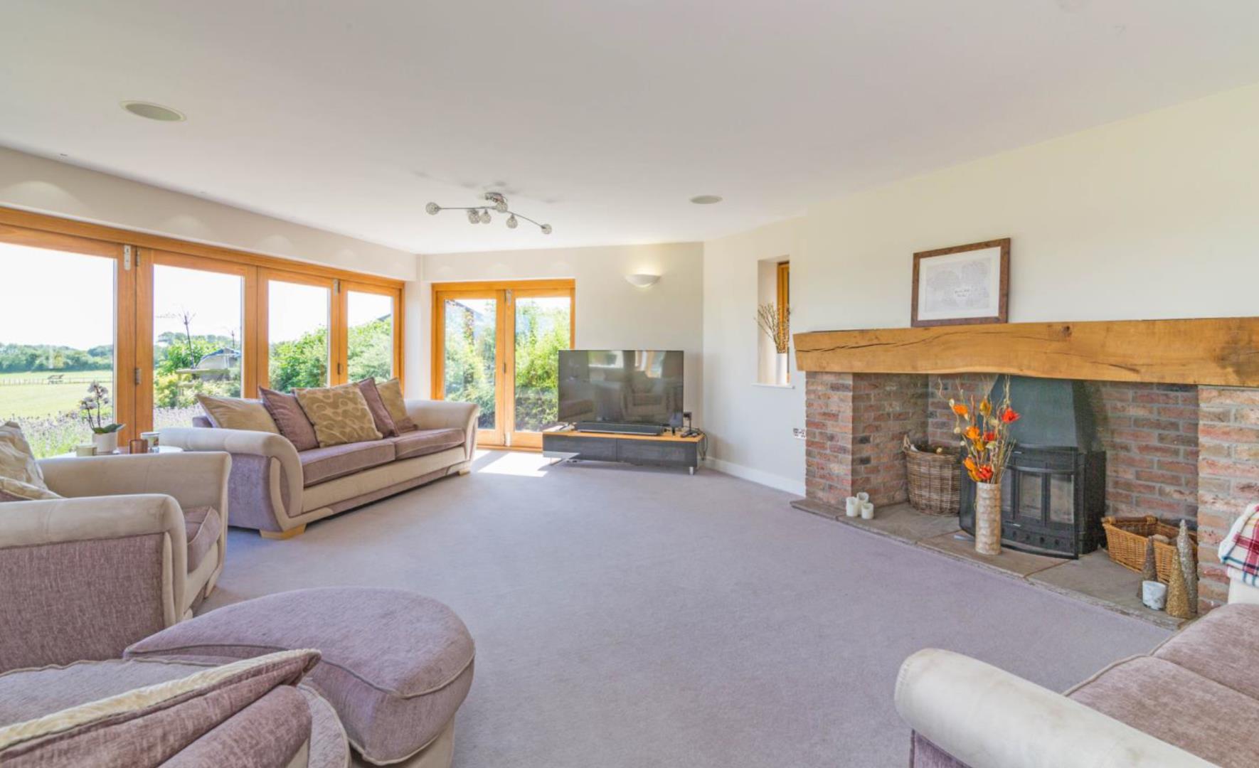 Lounge. Sitting area. Rectangular room. Underfloor heating. Fitted carpet. Tri-fold door. Door to garden. Inglenook fireplace. TV aerial point. Cat 6 Network point. Recessed spot lights. Low voltage lighting. Down lighting.