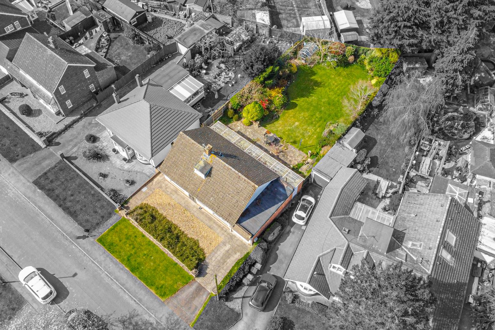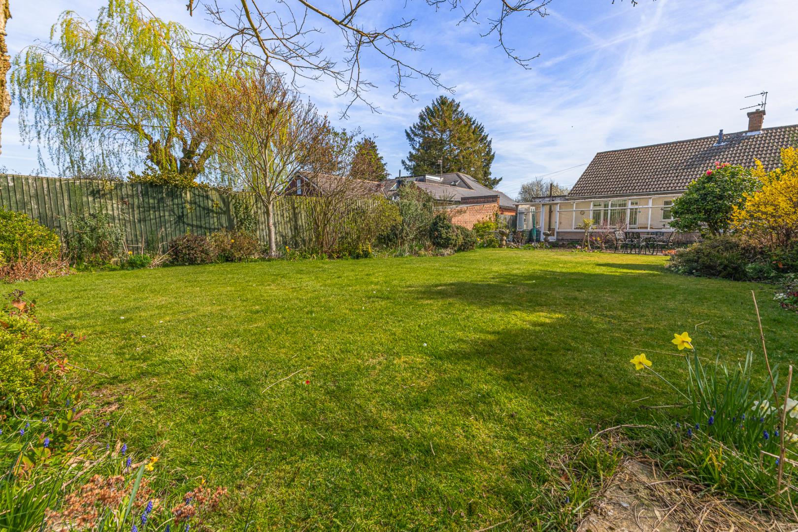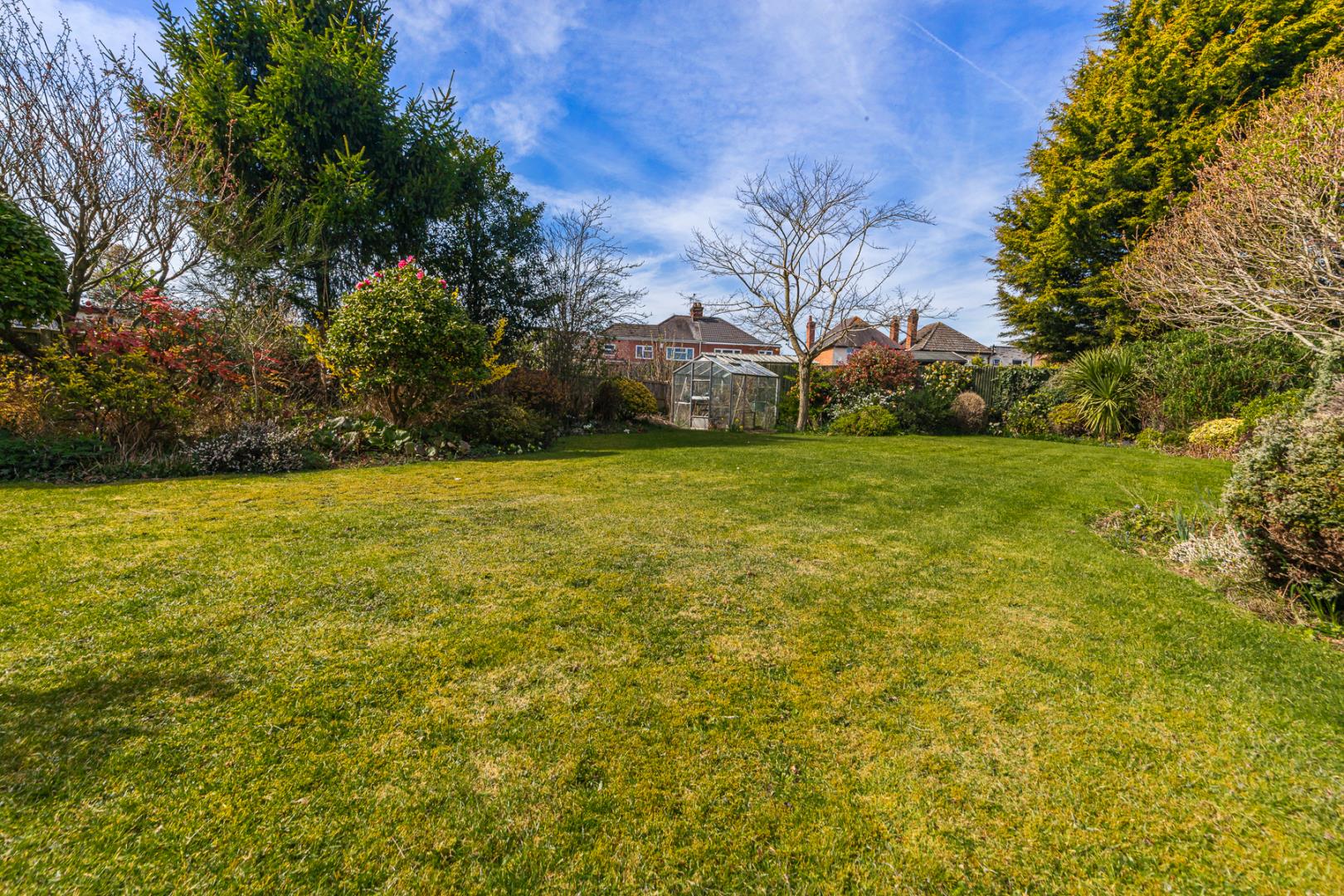 • Expansive rear and side gardens, beautifully maintained with lawns, greenhouse, mature shrubs, and planting.