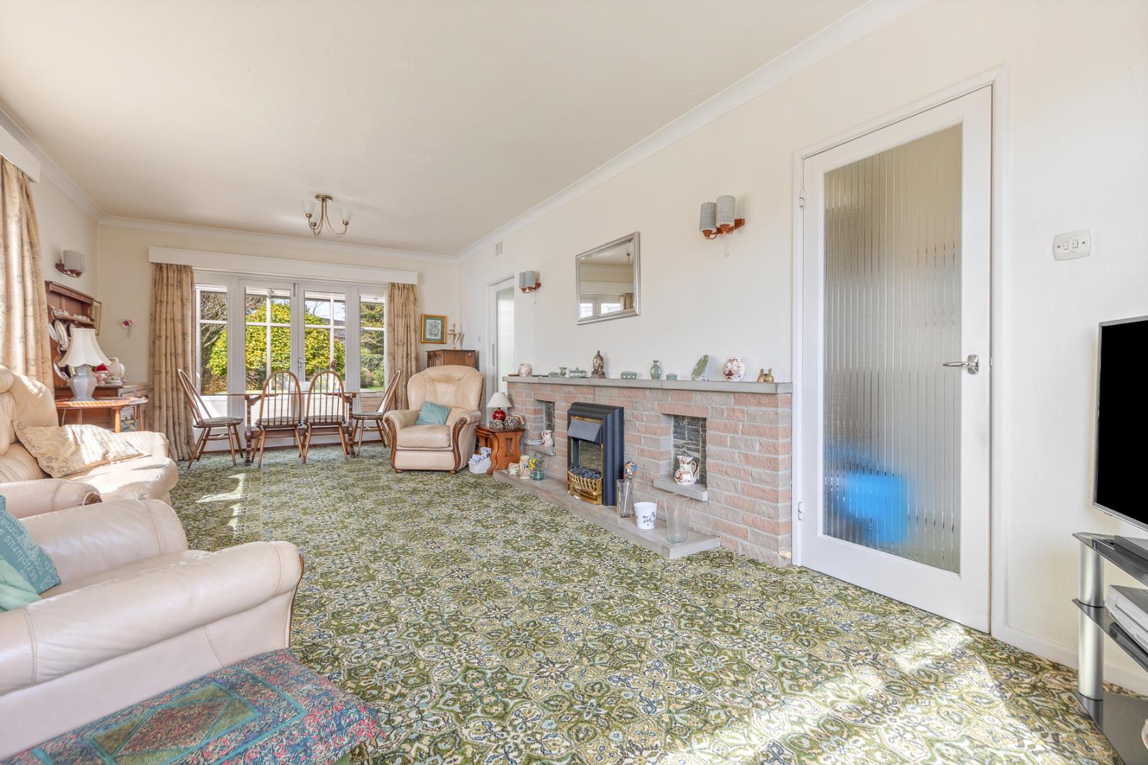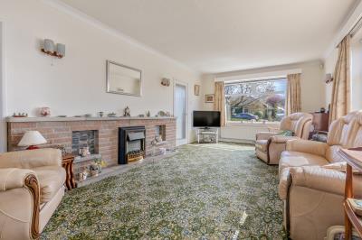 • Large dual-aspect lounge/diner with electric fireplace, offering plenty of natural light and ample space for both seating and dining areas overlooking the rear garden.