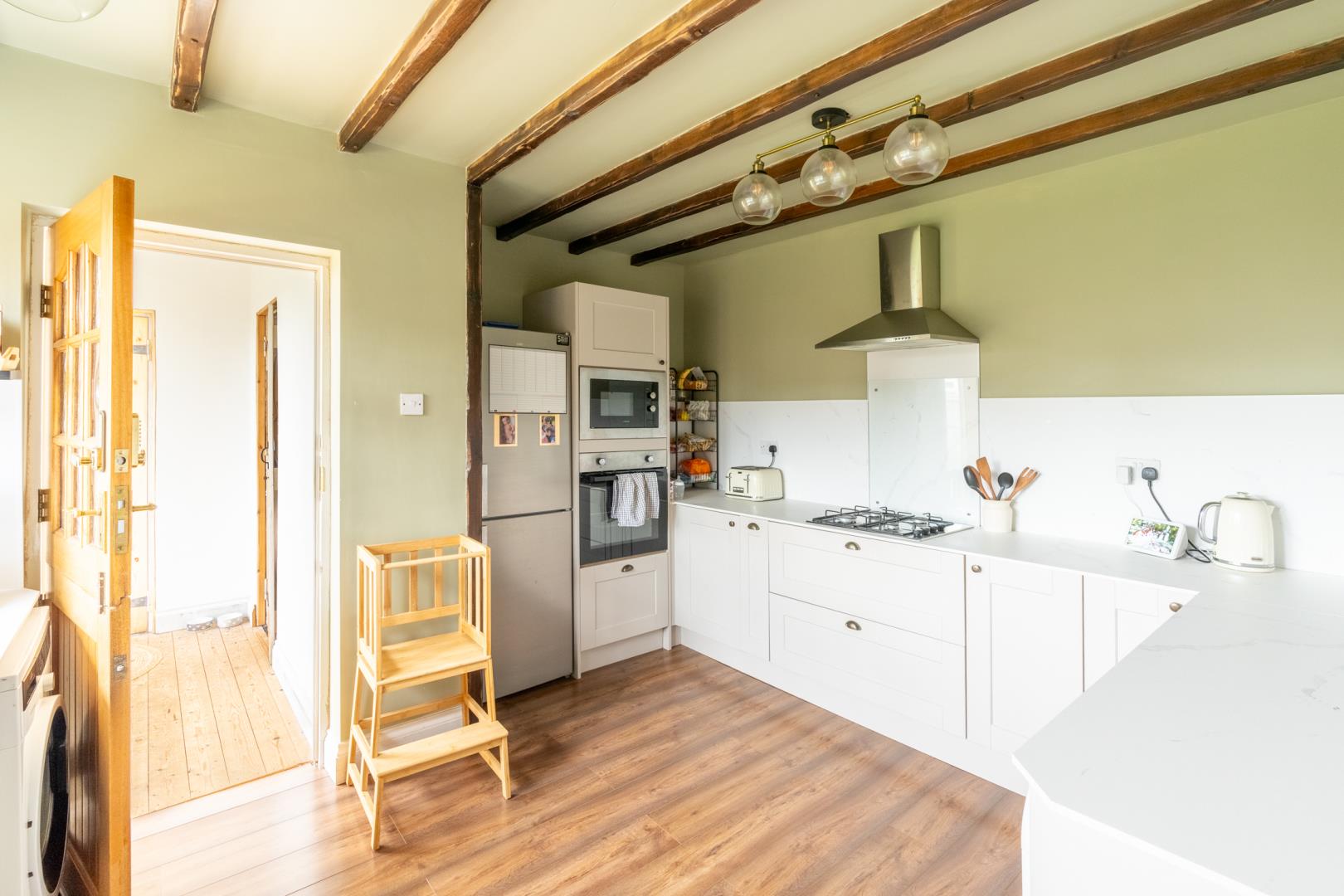 As you enter the property’s hallway through the stylish, sliding doors, you instantly know how wonderfully this property is finished. Head into the modernised kitchen and you’ll soon realise what a wonderful space this is for preparing your meals! There is a lot of storage space on offer with wall and base units, space for a washing machine, dryer, dishwasher & fridge freezer. A microwave, electric oven and gas hob are included as integrated goods. Exposed beams can be seen above which only adds to the charm of this beautiful home.