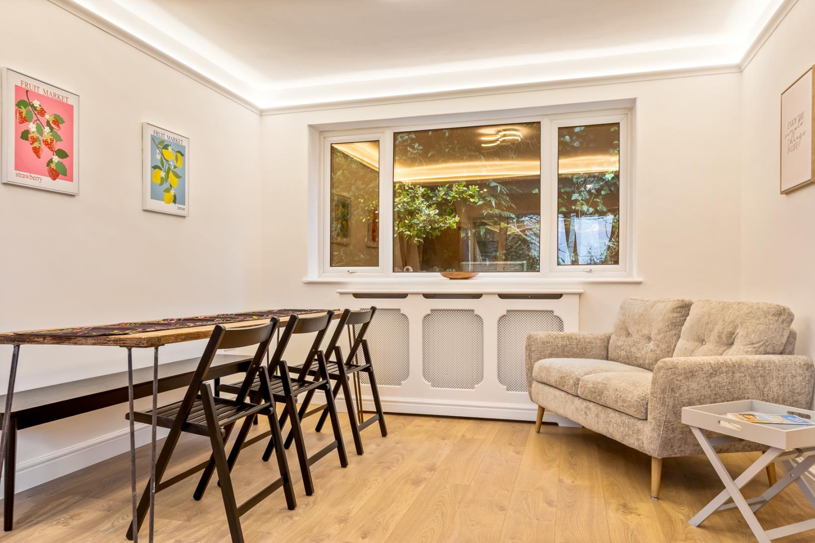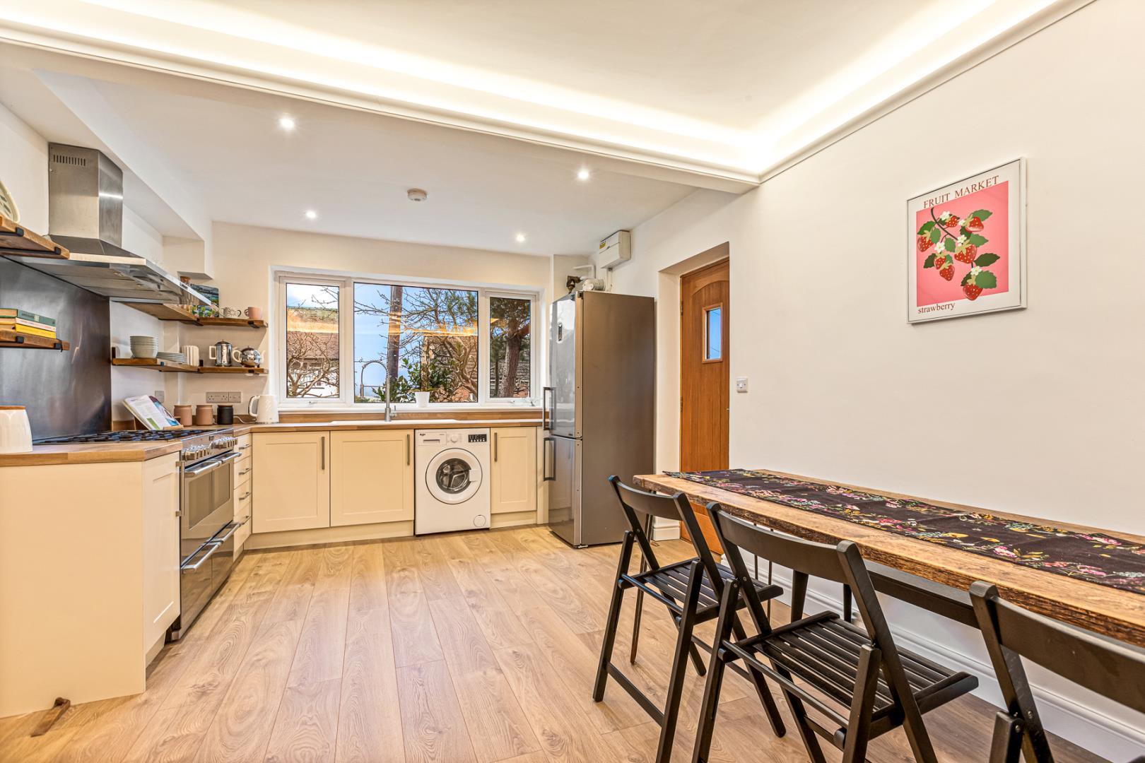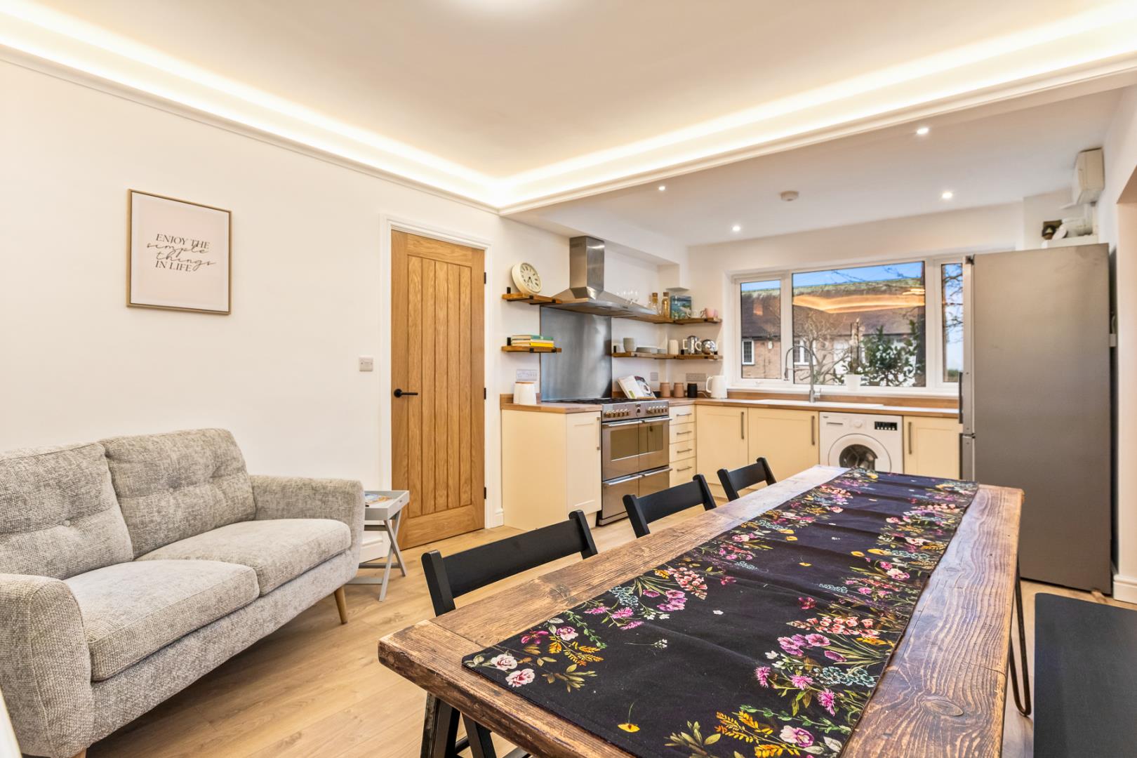 The dining kitchen is beautifully appointed with cream cabinetry, oak shelving and wood-effect work surfaces, complemented by integrated appliances and modern lighting. With windows to both front and rear elevations and space for a dining table, it is perfectly suited to both everyday living and entertaining, with direct access to the garden.