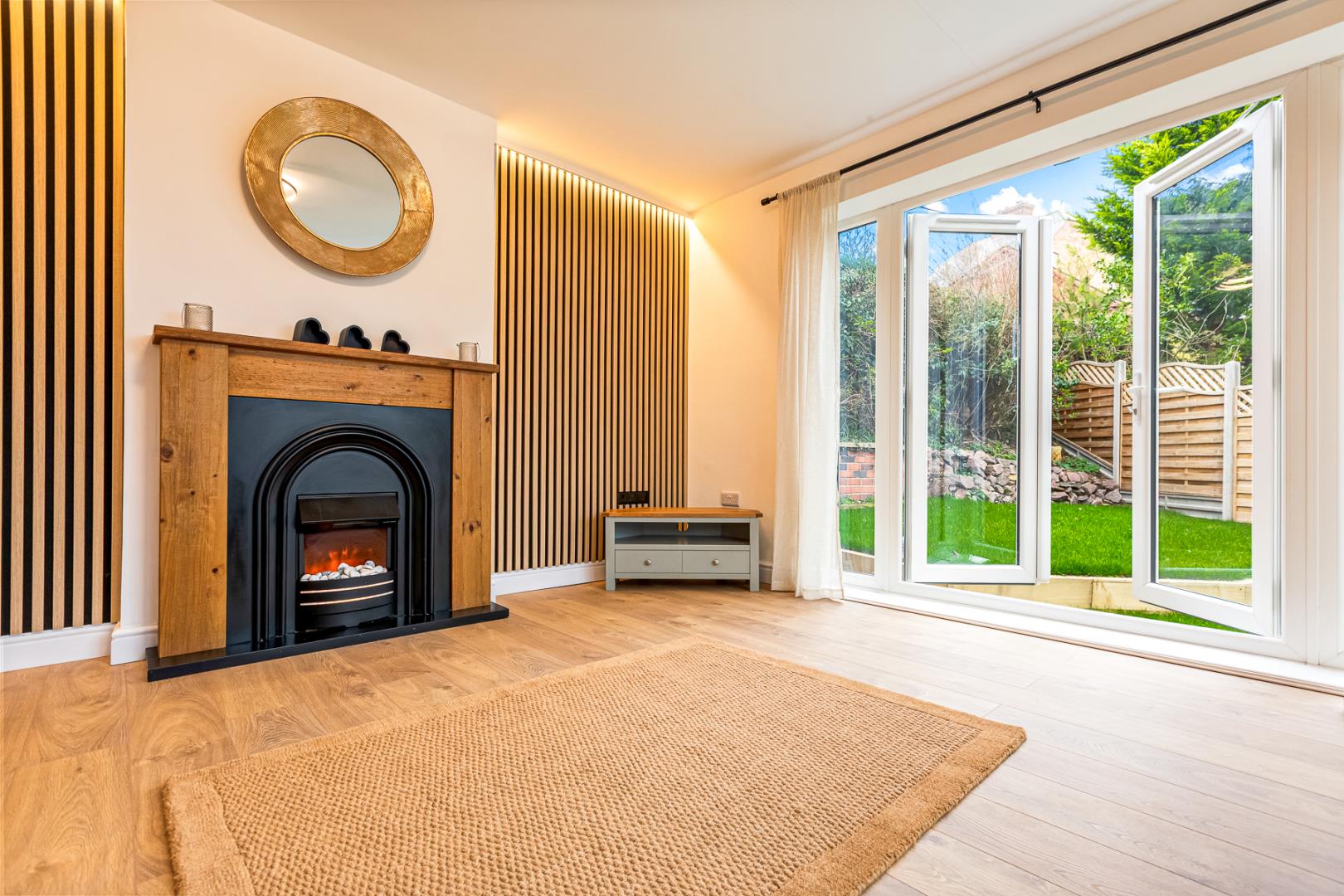 A charming brick-edged approach opens into a bright and welcoming entrance hall, finished with wood-effect flooring and a striking black staircase. The principal sitting room is both stylish and inviting, featuring a front-facing window, a contemporary electric fireplace with wooden surround, recessed lighting and French doors opening onto a lawned side garden.