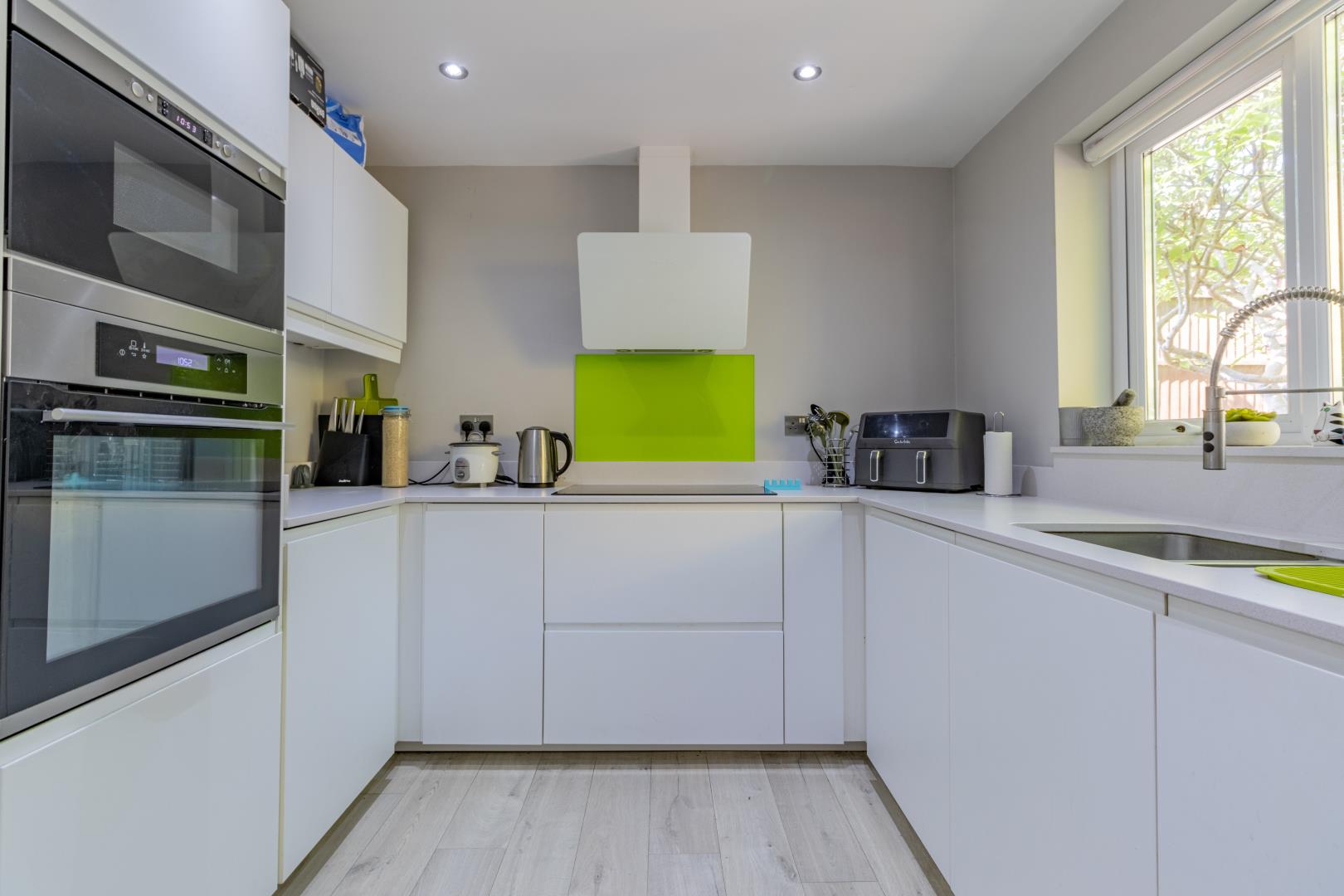 Step through the front door and you’re immediately greeted by a sense of flow and harmony. The bright, contemporary kitchen, finished in a sleek white design, opens seamlessly into a spacious dining room, bathed in natural light and offering effortless access to the private patio beyond — perfect for leisurely breakfasts, weekend entertaining, or watching the sunset with a glass in hand.