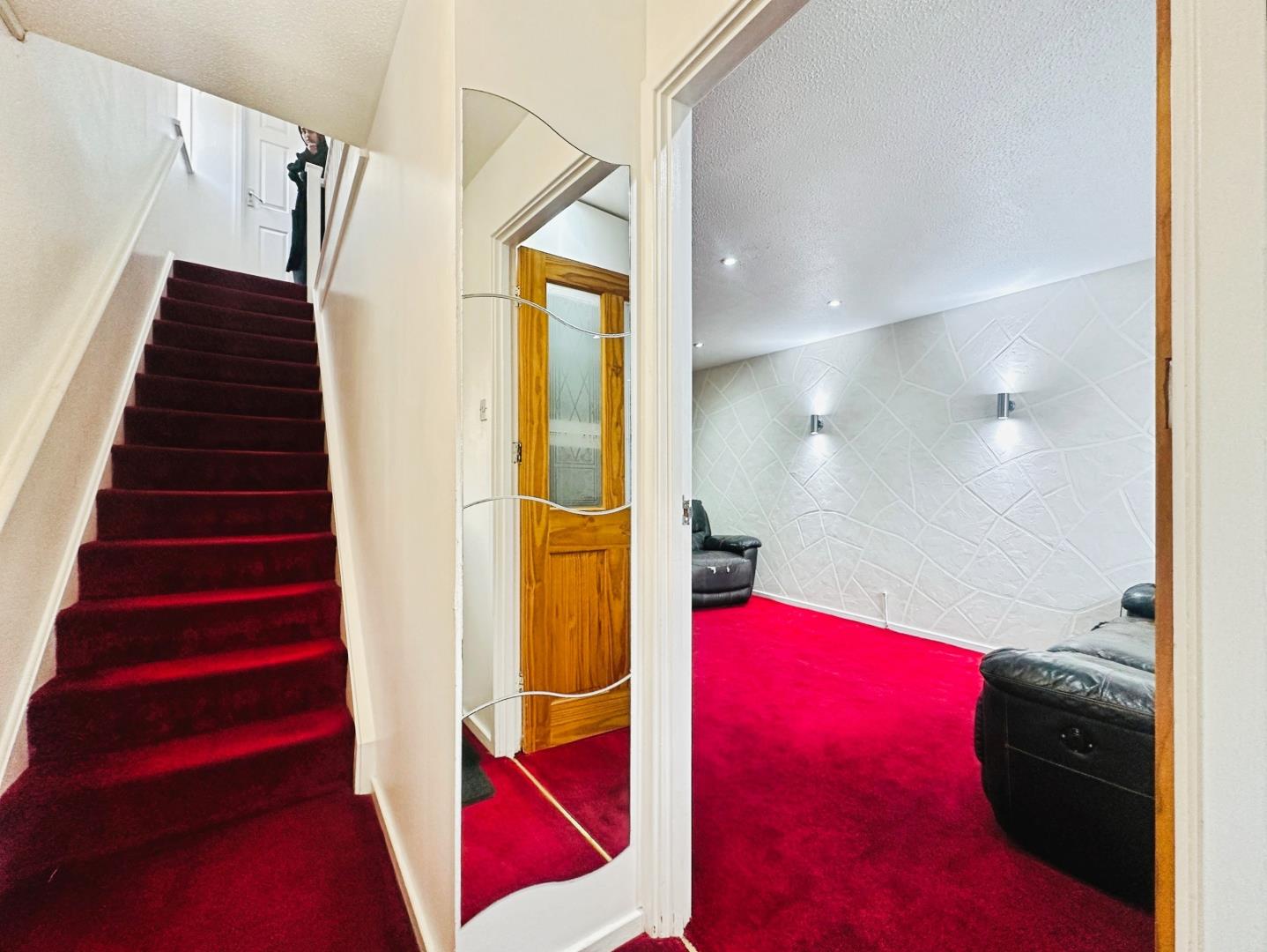 On entering the home, you are welcomed into the entrance hall, complete with carpeted flooring, stairs to the first floor and access into the lounge. The generous lounge (4.668m x 3.342m) provides a comfortable living space with spotlighting, accent lighting and a front-facing double-glazed window, flowing seamlessly into the open-plan kitchen/diner (4.317m x 2.842m). This space is fitted with a range of base and eye-level units, with space for a gas burner and oven, an integrated extractor, and plumbing for both a dishwasher and fridge. A handy under-stairs storage cupboard adds practicality, while the dining area overlooks the rear garden. A UPVC door provides direct access outside.