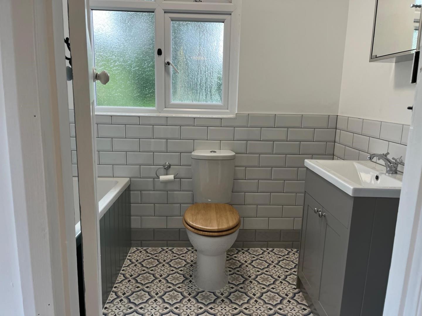 Bathtub. Heated towel rail. Mirrored cabinet. Rain fall shower. Shower over the bath. Toilet. Washbasin with mixer tap. Windows to rear.