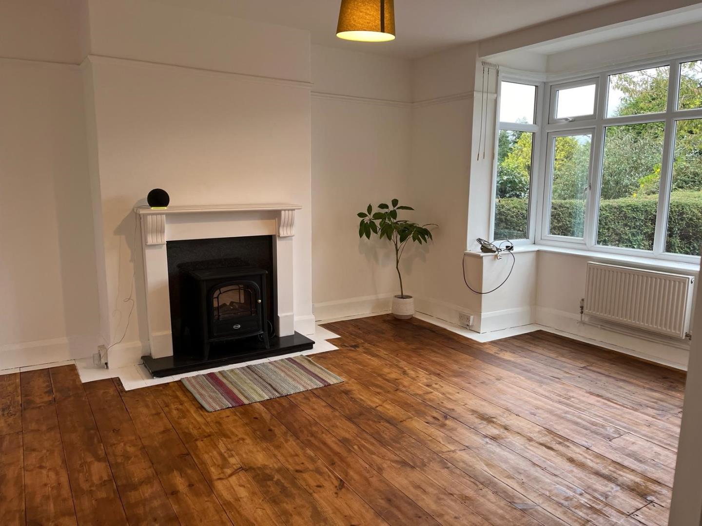 Lounge. Pine Wood flooring. Bay window. Decorative fireplace.