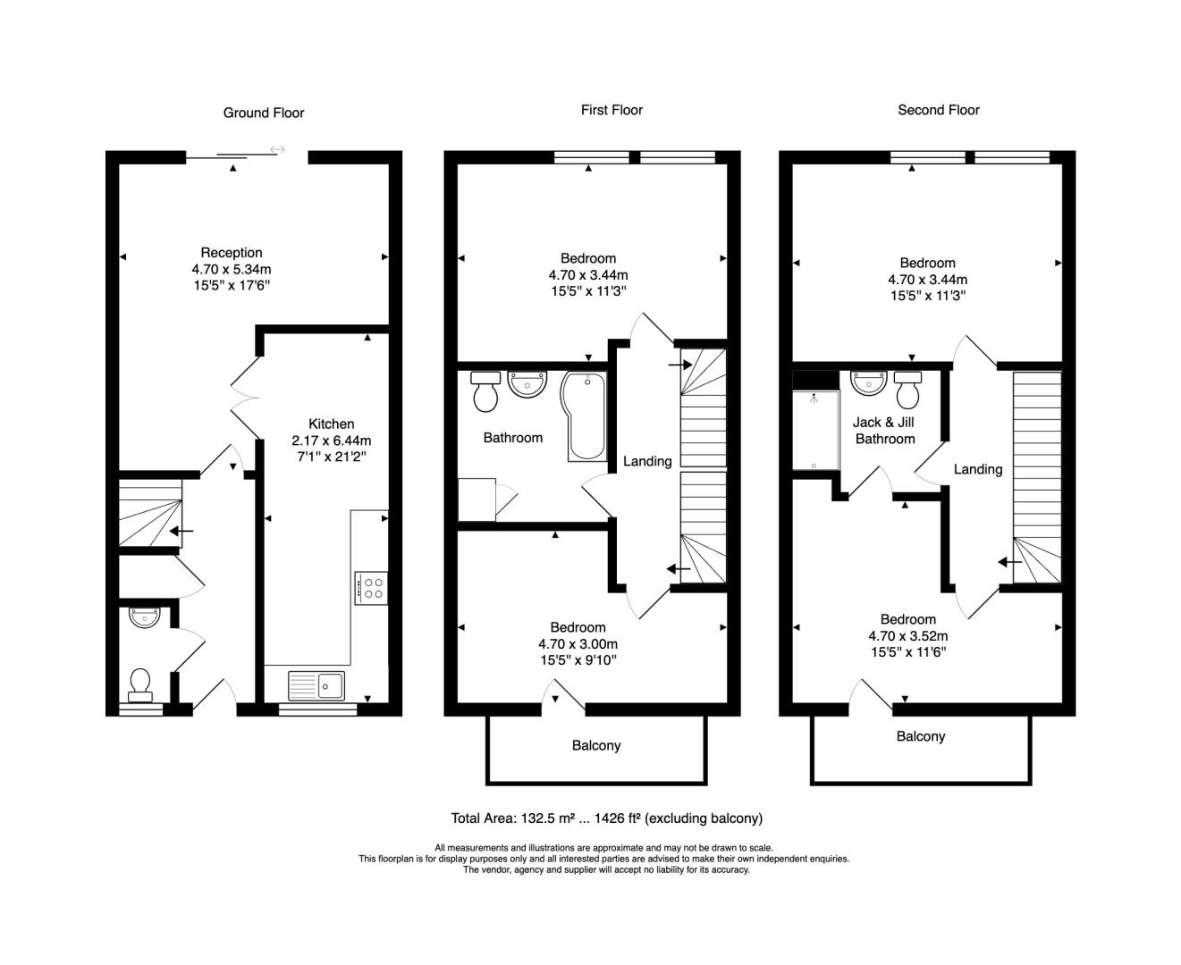 The top floor has two more double bedrooms, with Bedroom 1 featuring a private balcony and a Jack & Jill shower room with a double shower and raindrop showerhead.