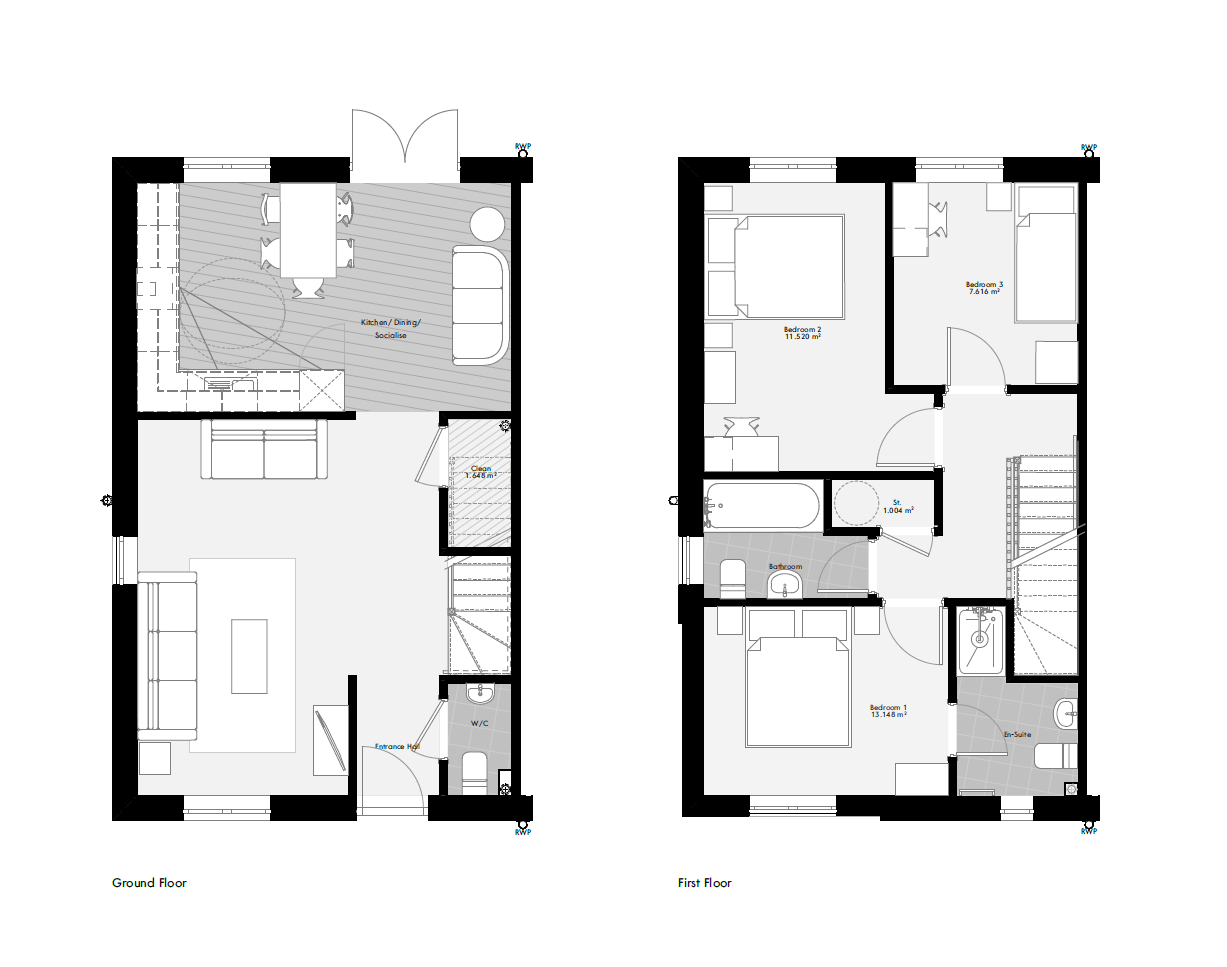 - Separate shower cubicles where shown with low entry shower tray, glazed shower screen and thermostatically controlled shower valve. Showers to have handset shower head.